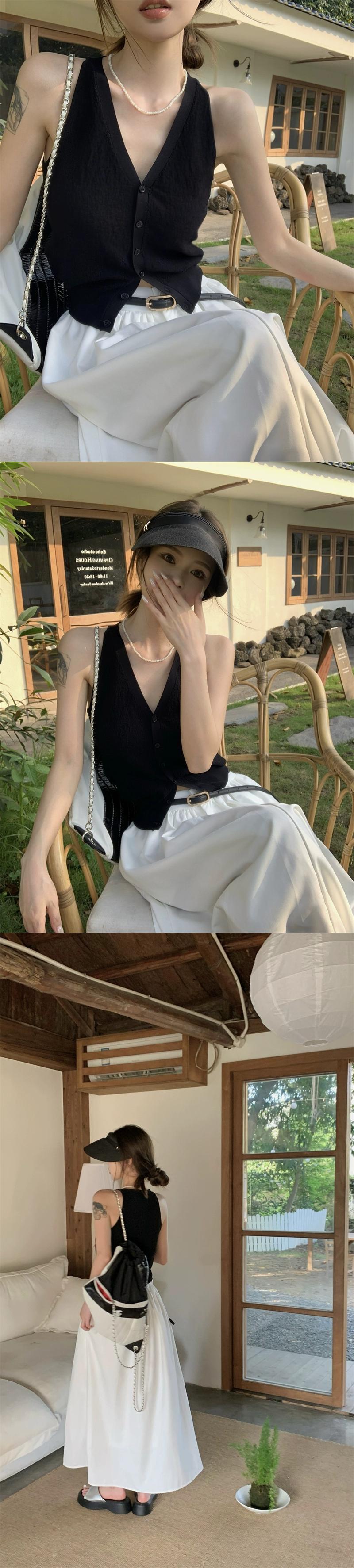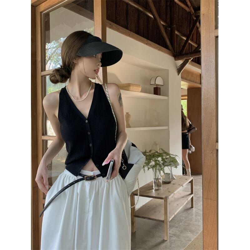 ブラック V ネック シングルブレスト ノースリーブ ニット ベスト レディース サマー スタイル シンプル オールマッチ スリム フィット ショート アウター トップ 夏物 Vネック 0921989495966964