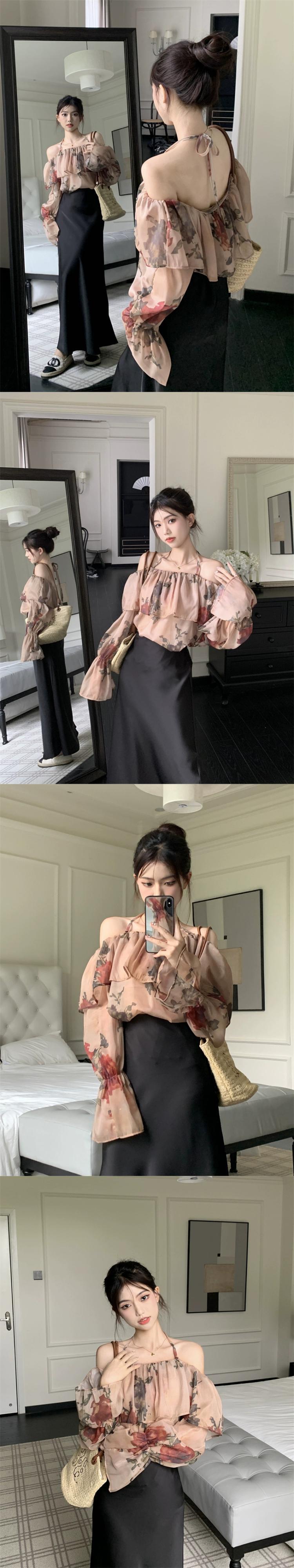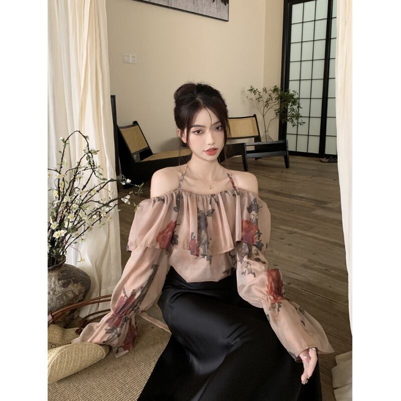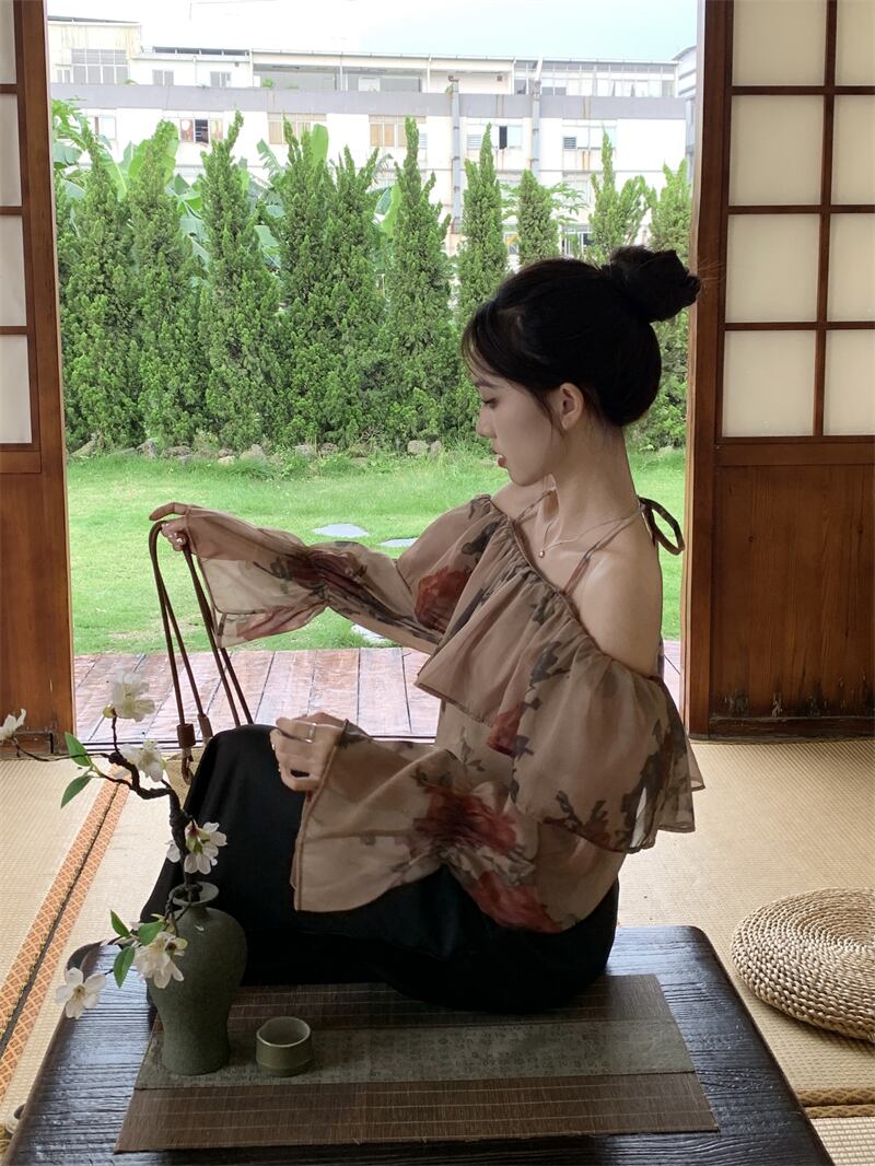ワンショルダー トランペットスリーブ シフォン シャツ レディース 夏 レトロ プリント ハンギング ネック シャツ フリル オフショルダー 長袖 トップ ロング サマー 夏物 0921987214734433