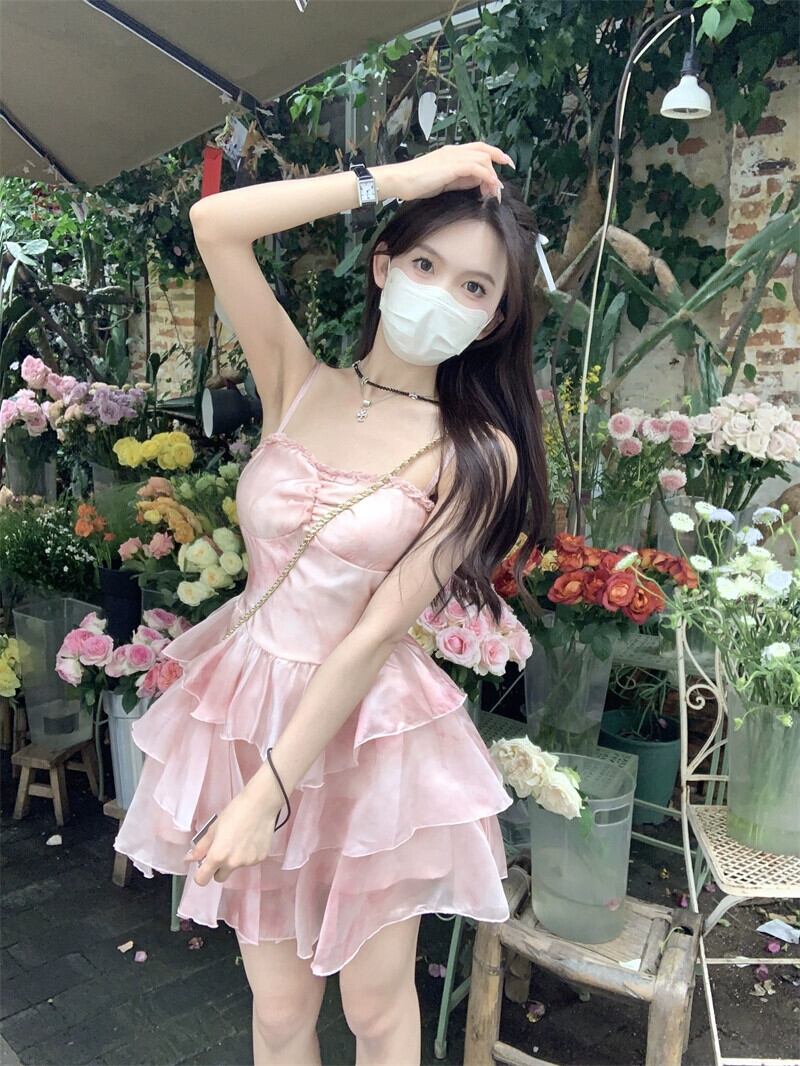 純粋な欲望甘い風ピンクサスペンダードレス女性の夏の 2023 新しい雰囲気感覚ウエスト痩身ケーキスカート 大人ガーリー スウィート キュート カジュアル サマー 夏物 0921963436806751