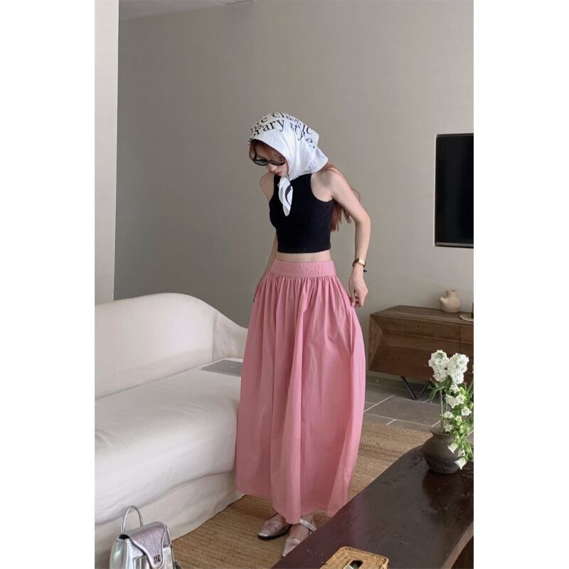 フランスの気質の優しい風無地スカート女性の夏の 2023 新しいミッドレングスハイウエスト細い A ラインスカート ハイウェスト サマー 夏物 Aライン ソリッドカラー 092193449474958