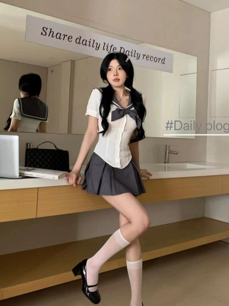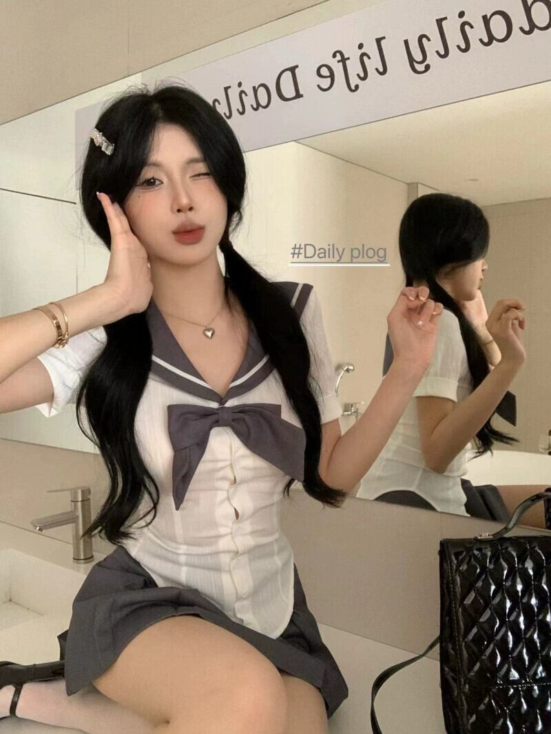 スパイスガール ネイビー襟 イレギュラーショートシャツ レディース サマースーツ プリーツスカート ショートスカート プレッピー 2点セット 夏物 0921988215347137