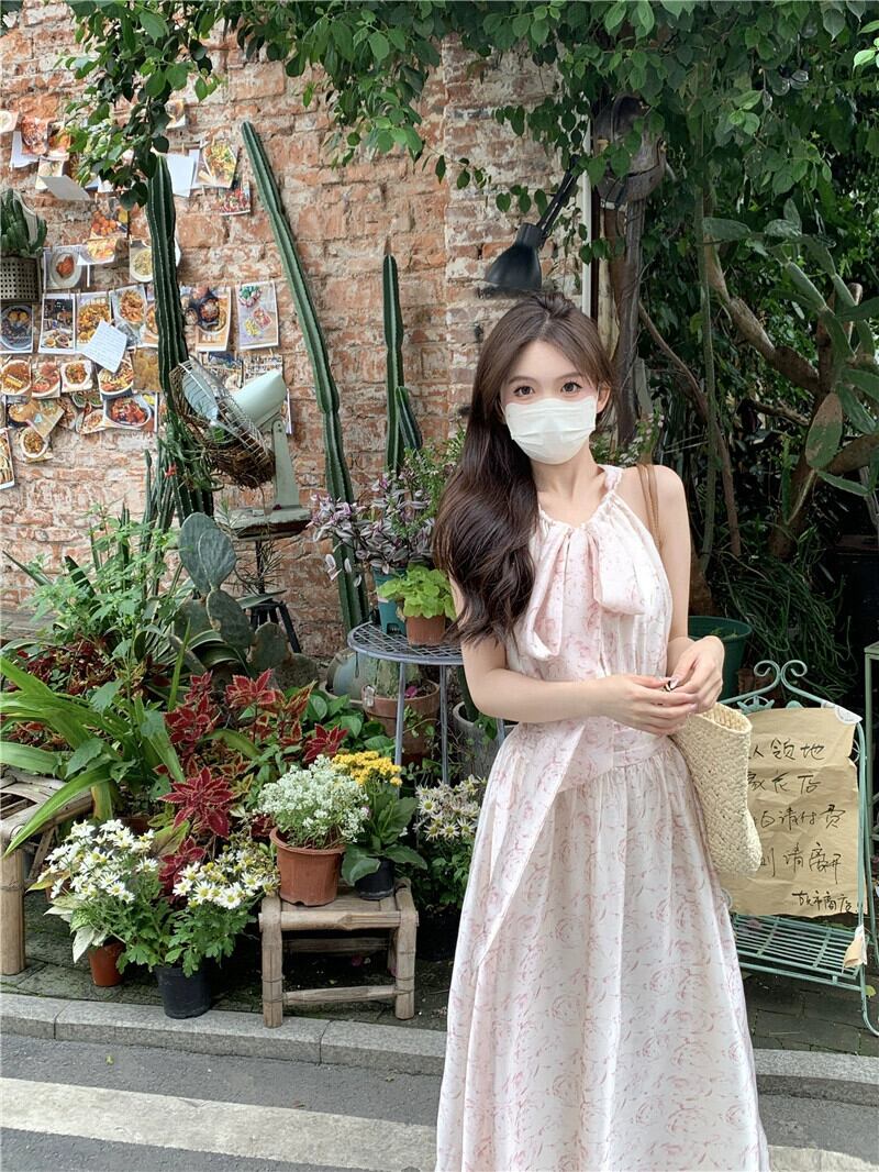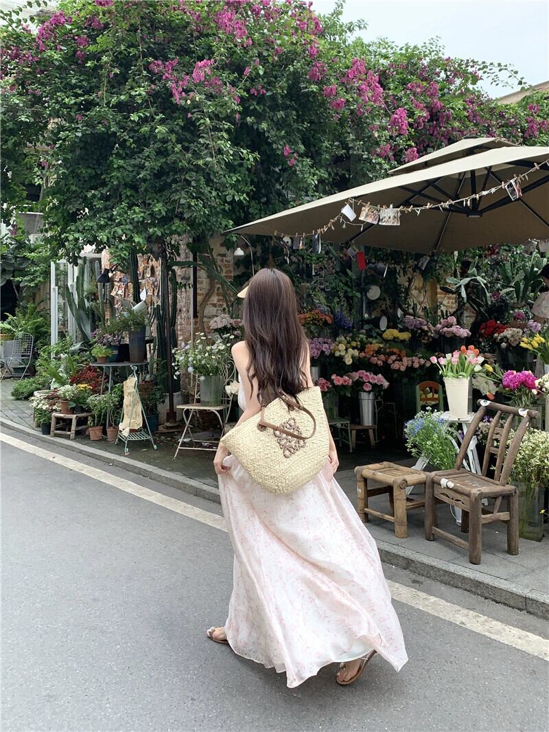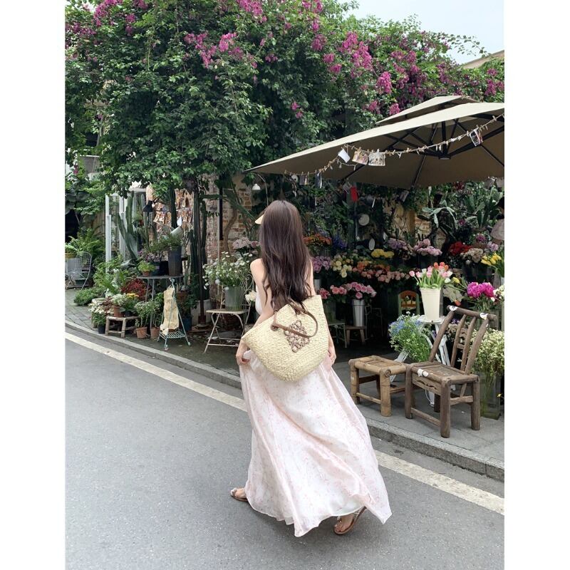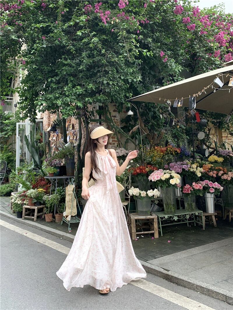 フランスの甘いピンクの花柄ストラップレスノースリーブドレスの女性の夏の 2023 新しい気質ウエスト痩身ドレス 大人ガーリー スウィート キュート カジュアル サマー 夏物 0921992605037101