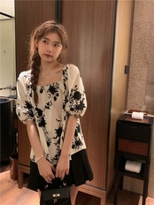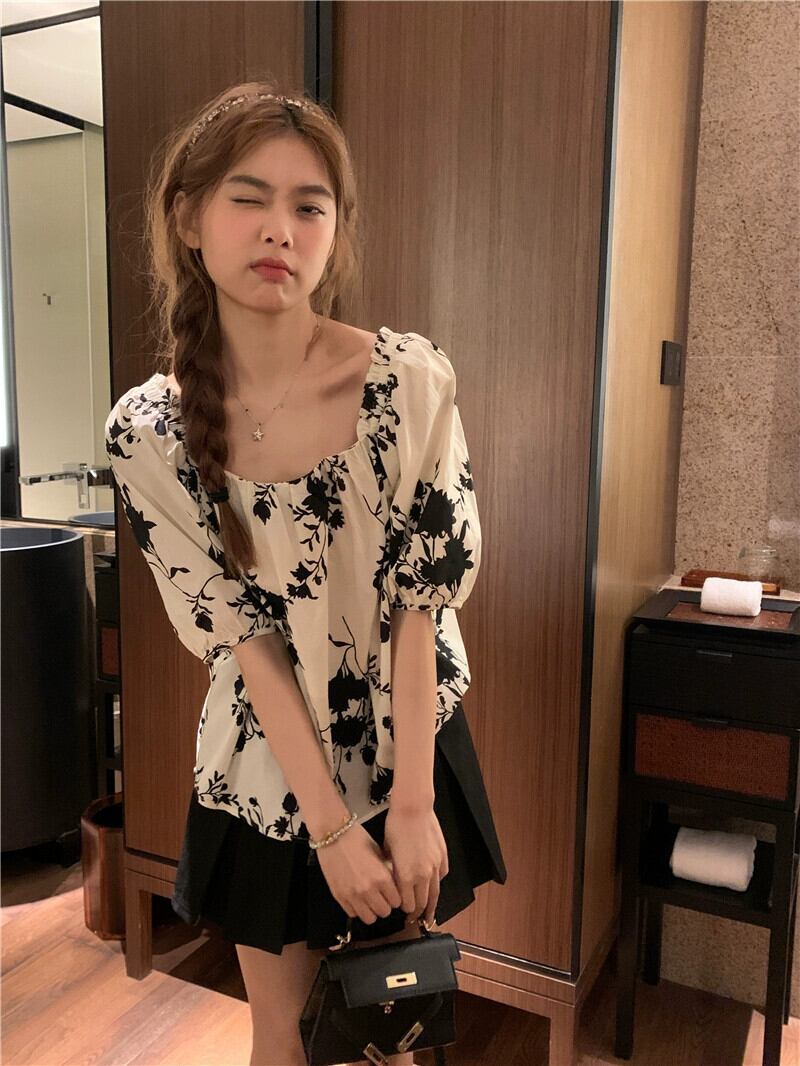 気質スクエアカラーインクプリントバブル半袖シャツ女性の夏の 2023 新しいレトロ老化ルーズトップ サマー 夏物 スクウェア 0921956762581564