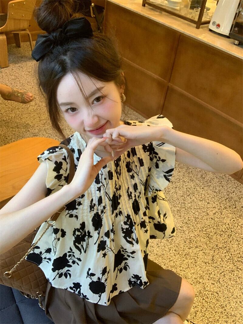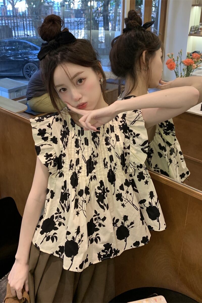 フランスの甘い水墨画フライングスリーブシャツ女性の夏のデザインセンスニッチショートシックな花柄シャツトップ 大人ガーリー スウィート キュート カジュアル サマー 夏物 0921940653817574