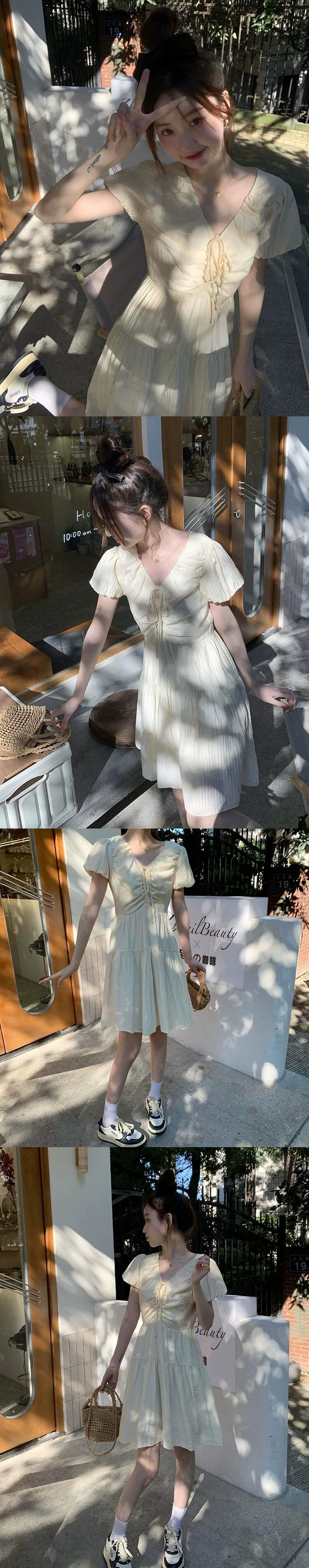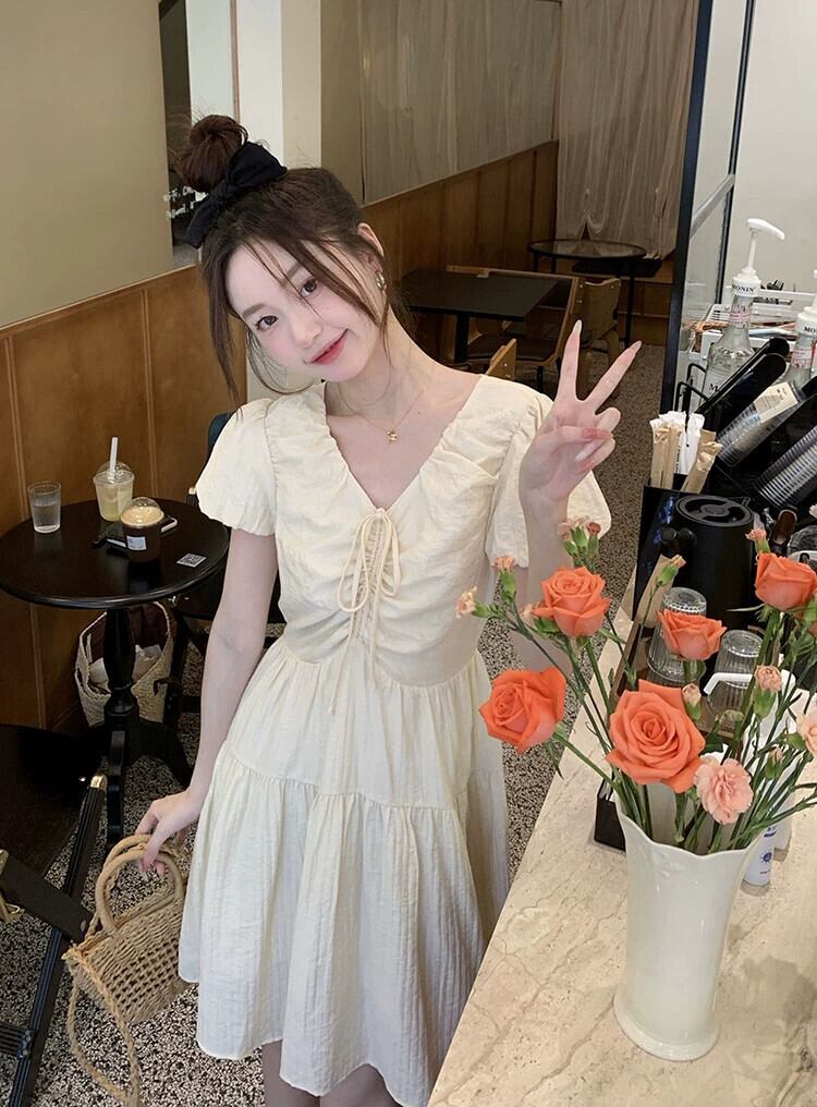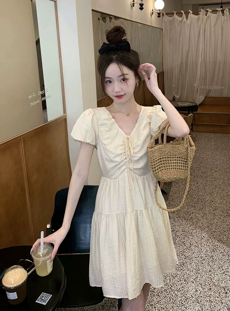 スタイル V ネック巾着デザインドレス女性の夏の 2023 新しいバブル半袖ウエスト痩身 A ラインスカート サマー 夏物 Vネック Aライン 0921938198031621