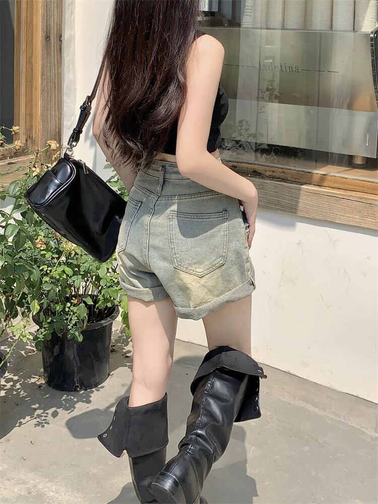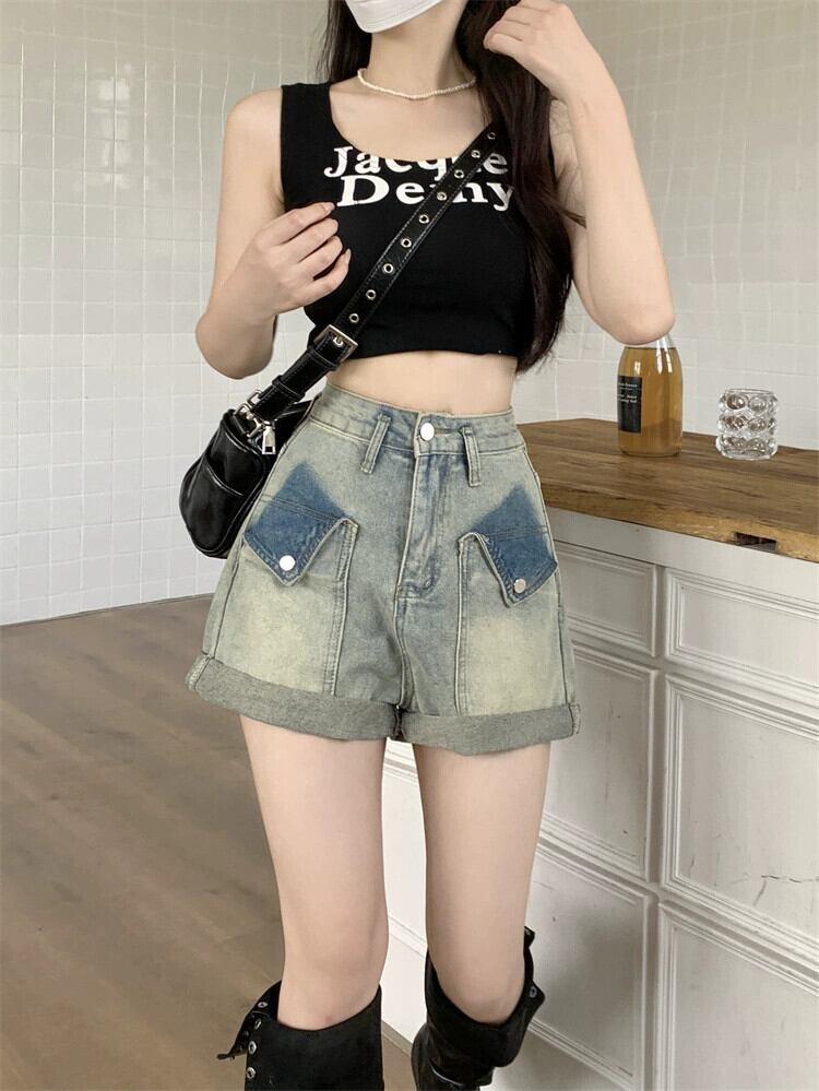 センスフランジングシックなコントラストカラーデニムショートパンツレディース2023夏新作レトロレトロ薄手ワイドレッグパンツ サマー 夏物 ショーツ ブルマー 0921972176052003