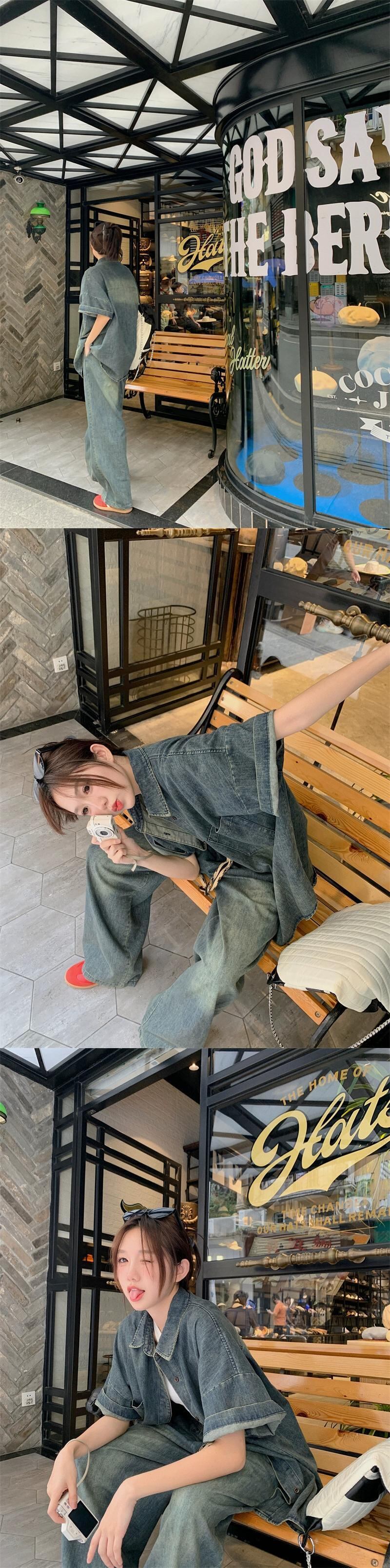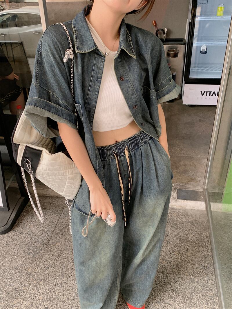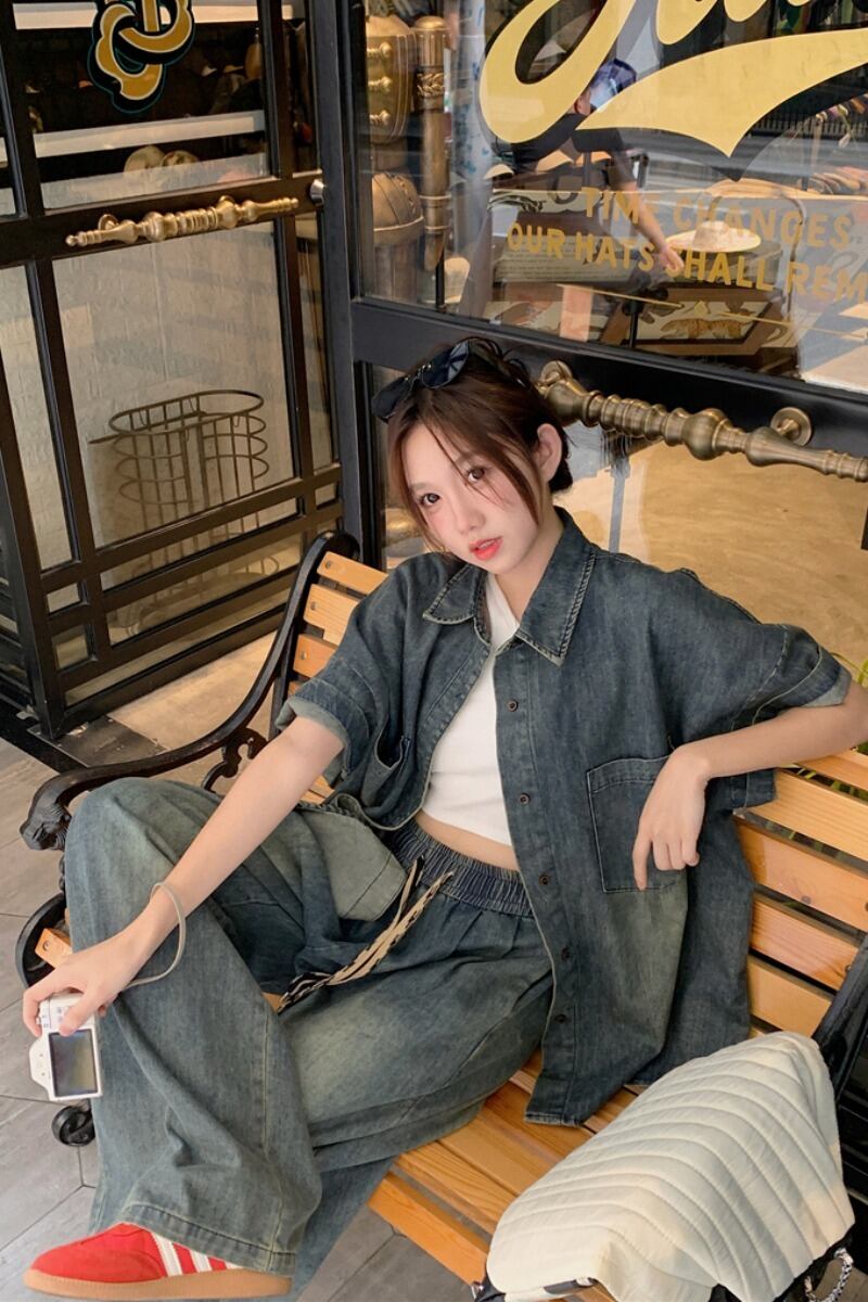 アメリカン デニム スーツ ウォッシュド オールド ルーズ 半袖 シャツ レディース 夏 巾着 ワイドレッグ パンツ ズボン 2 点セット トレンディ サマー 夏物 0921985704378354