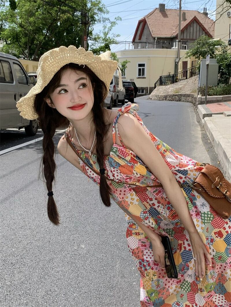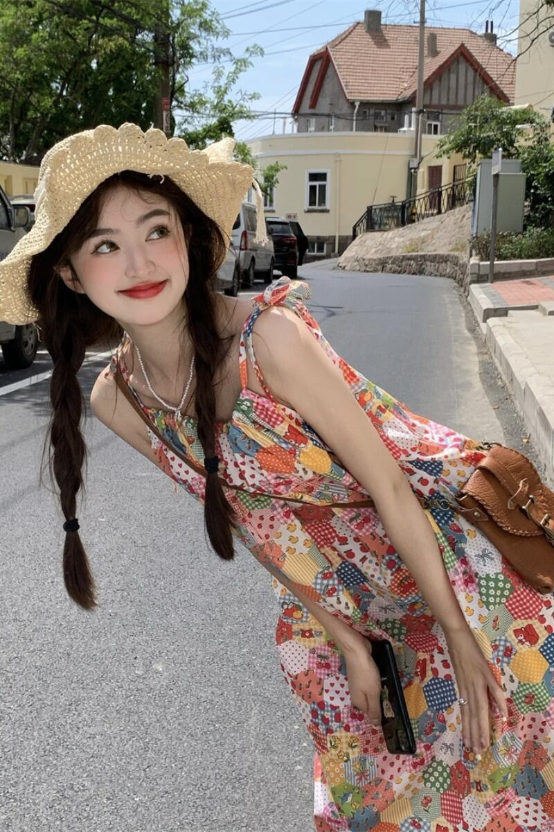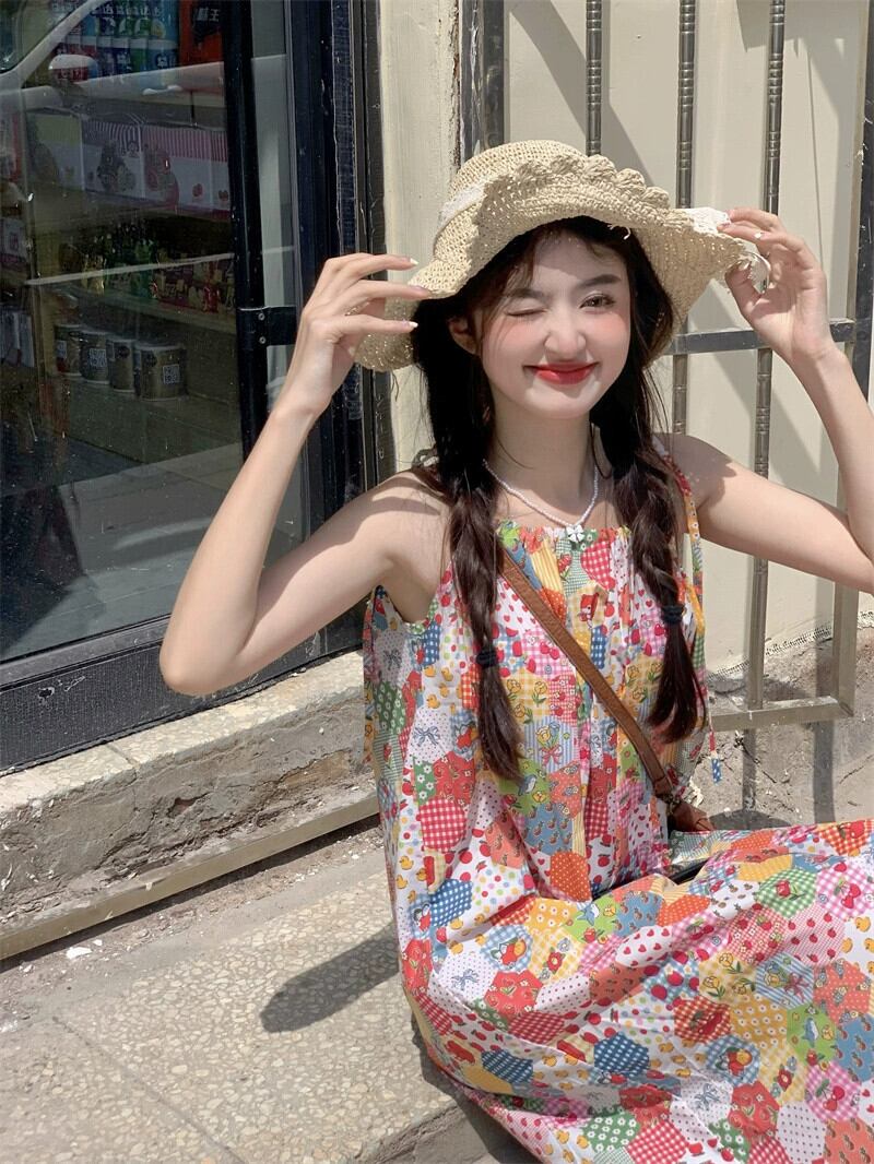 甘い女の子ホリデー花柄モザイクサスペンダードレス夏年齢軽減ロングスカートルーズカジュアルaラインスカート 大人ガーリー スウィート キュート サマー 夏物 0921947569911800