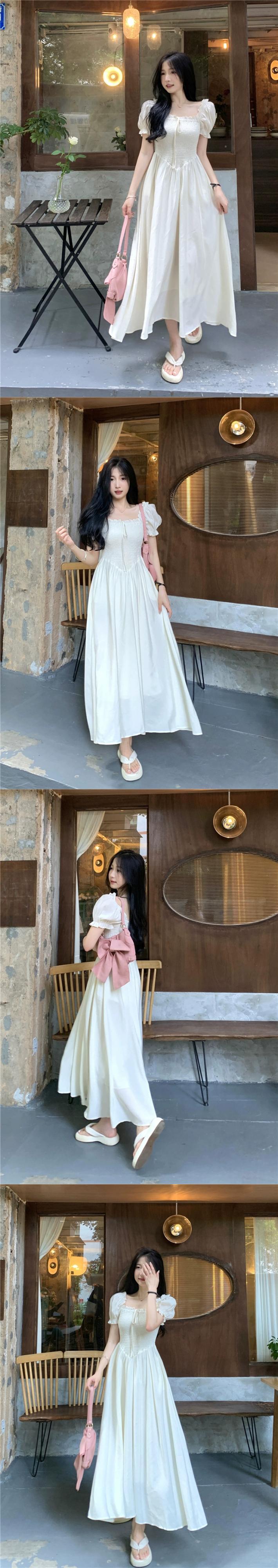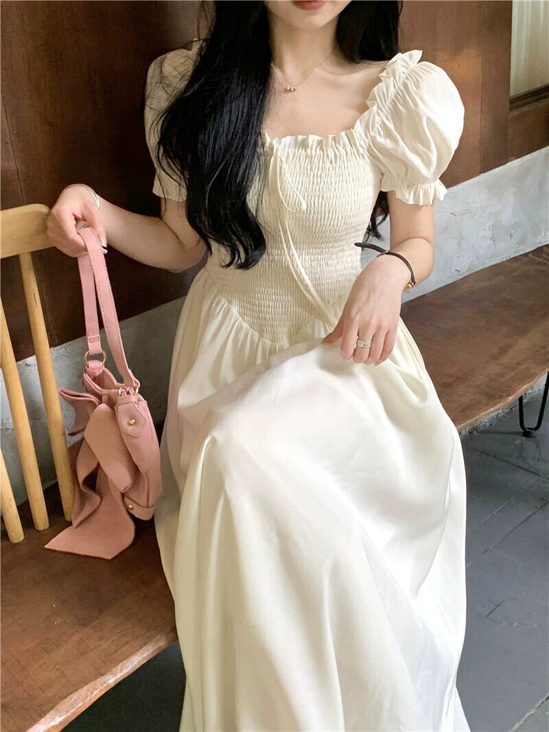 優しい風バブルスリーブスクエアネックドレス女性の夏の 2023 気質スリムスリム妖精妖精ミッドレングスドレス サマー 夏物 スクウェア 0921958291111325