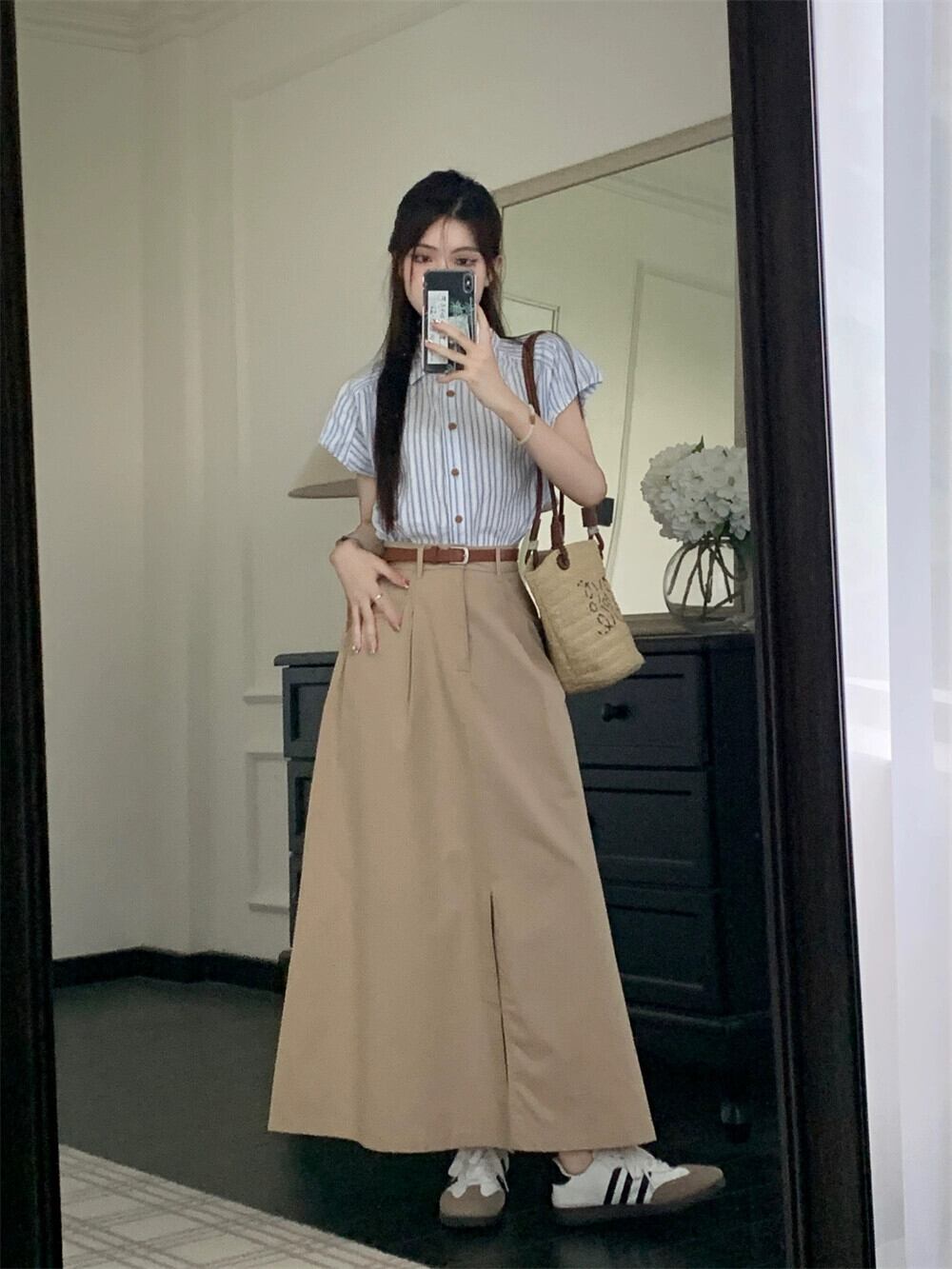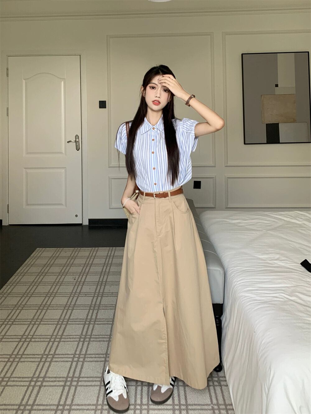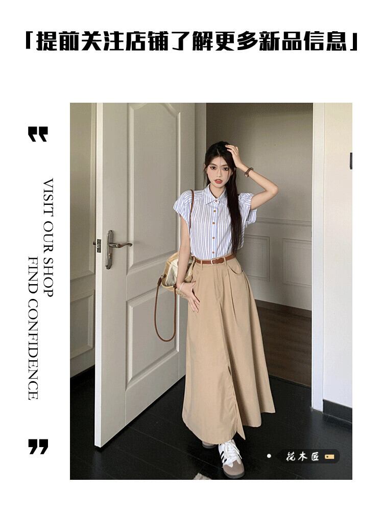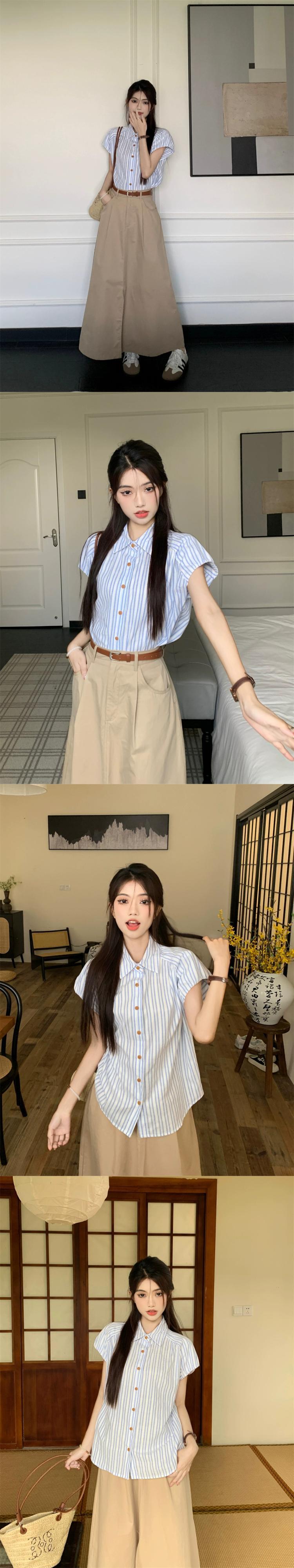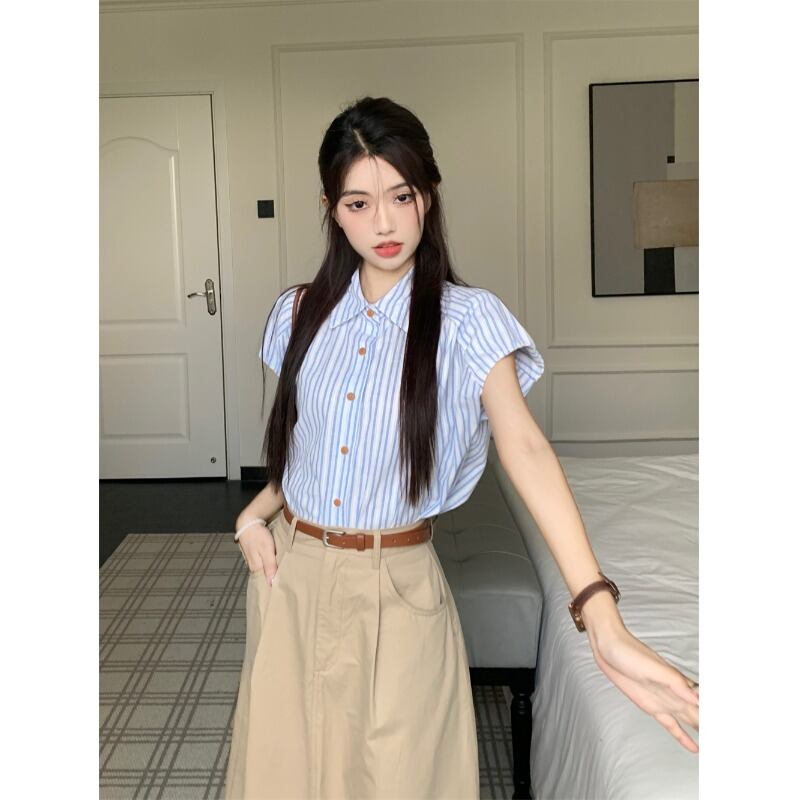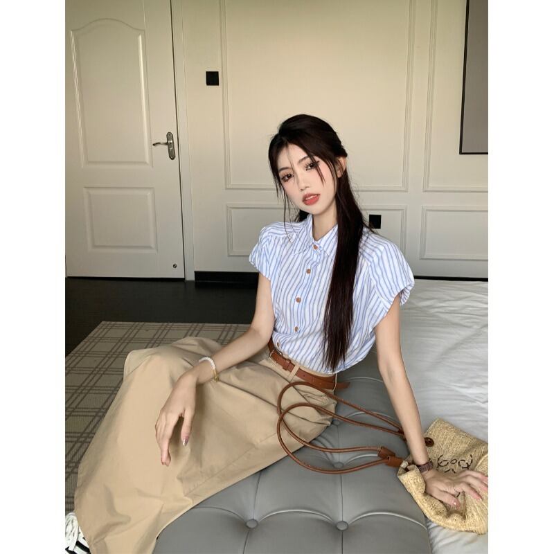 バージョンのストライプ小さなフライングスリーブシャツ女性の夏の 2023 新デザインオールマッチルーズスリムカーディガンシャツ潮 サマー 夏物 0921910350740830