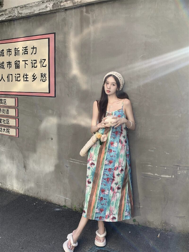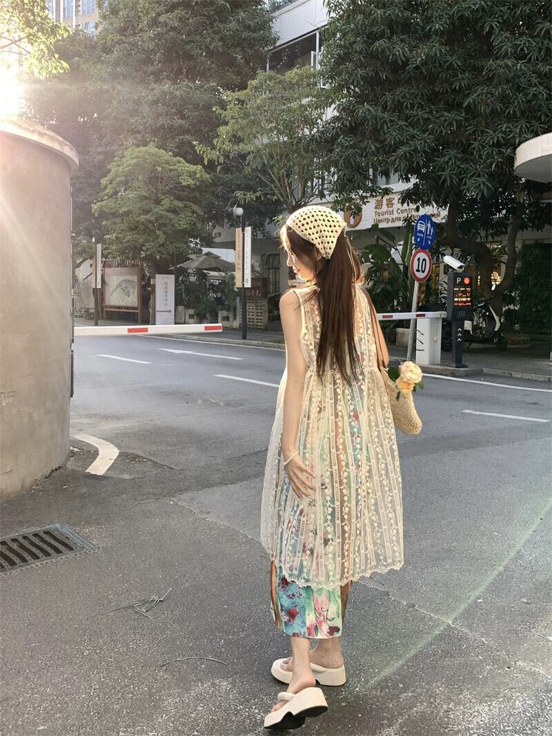 レトロファッションスーツスカート女性 2023 夏の新しい刺繍レースブラウスプリントサスペンダースカート 2 点セット サマー 夏物 0921968835630397