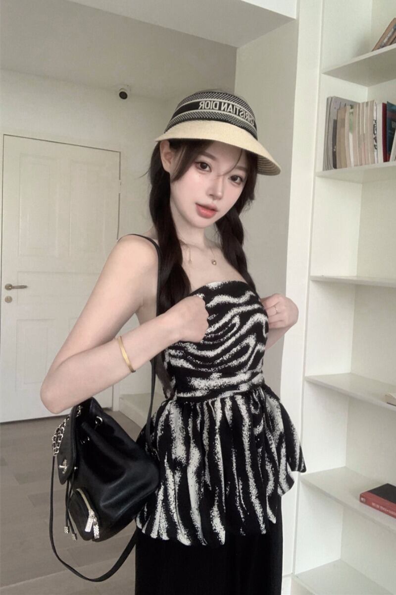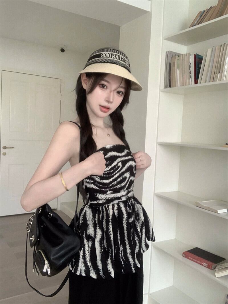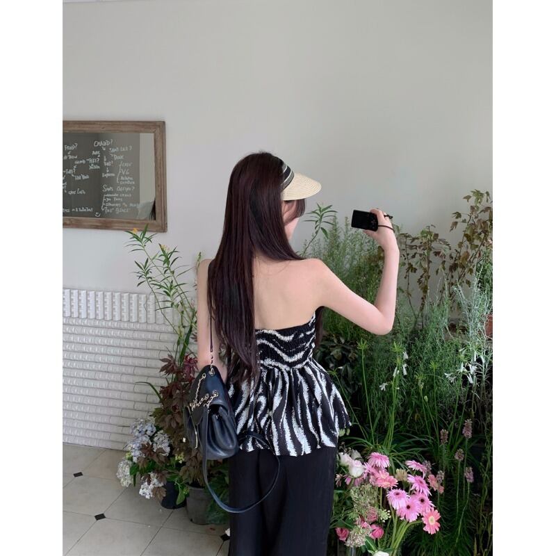 黒と白の波形デザインセンスニッチチューブトップベスト女性の夏の 2023 新しいウエスト痩身ノースリーブホルタートップ ホワイト ブラック サマー 夏物 0921958531272636