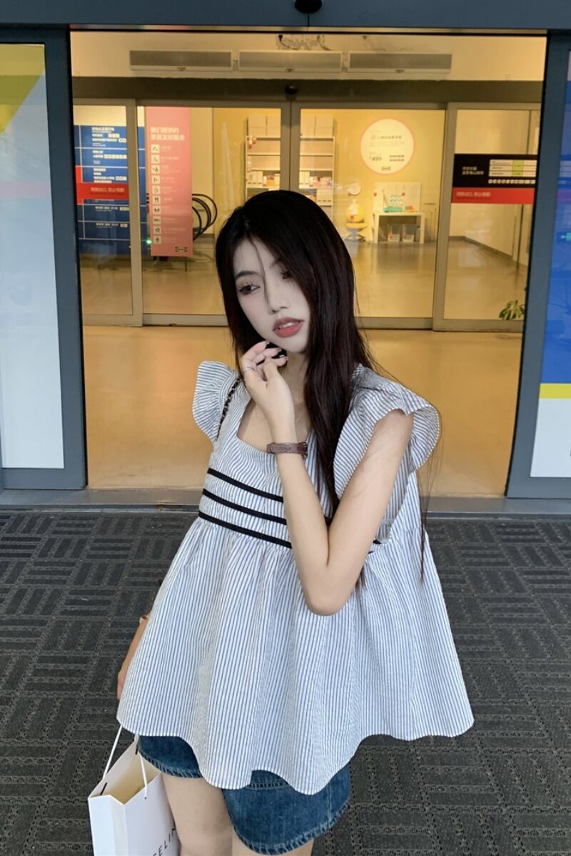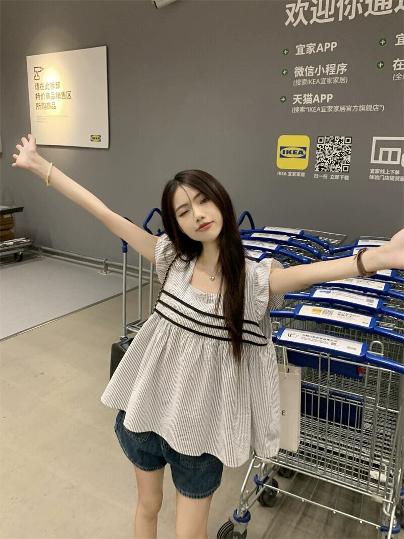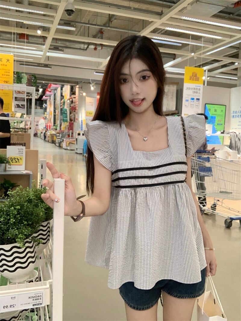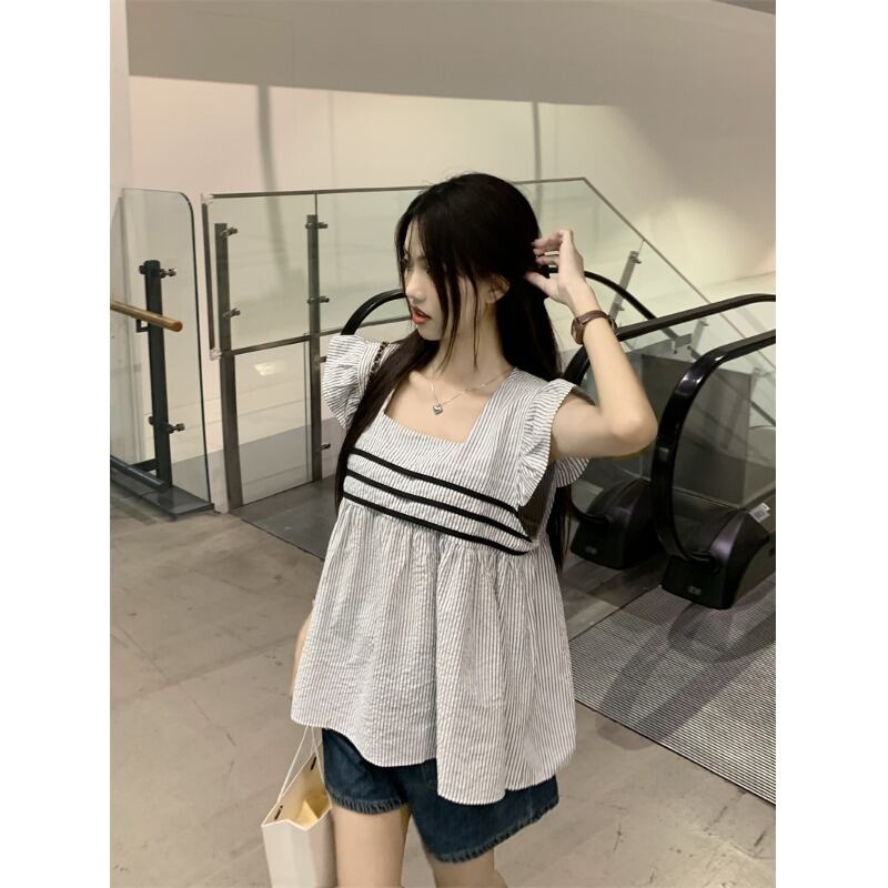 センススプライシングフライングスリーブストライプシャツ女性の夏 2023 ニューエイジ削減オールマッチスクエアカラースリムドールシャツ サマー 夏物 スクウェア 0921946331599840