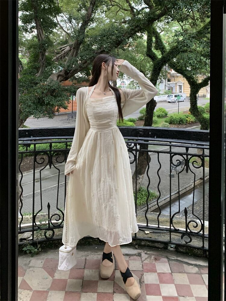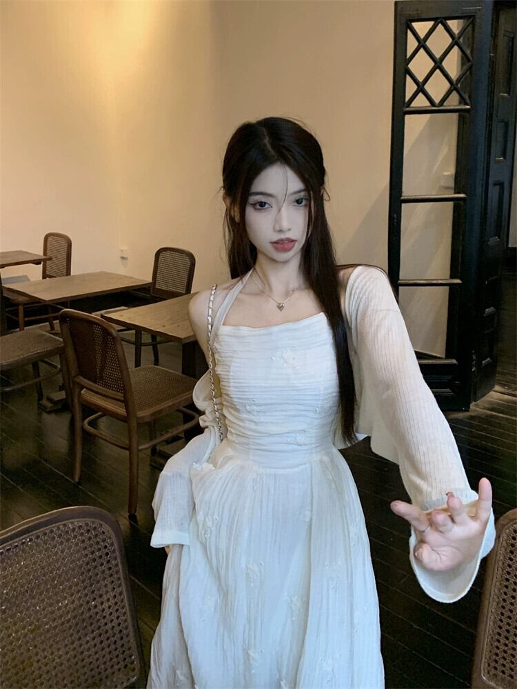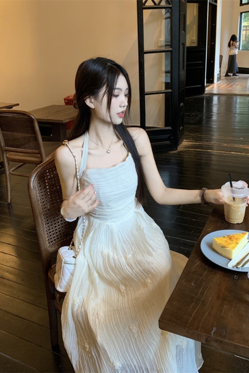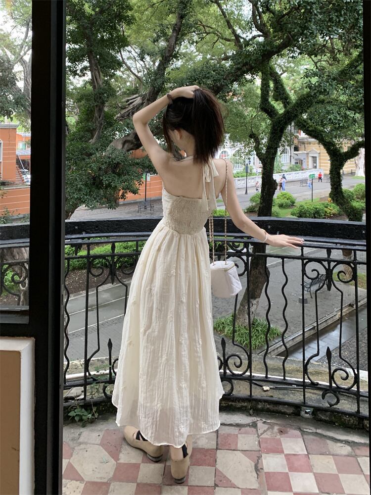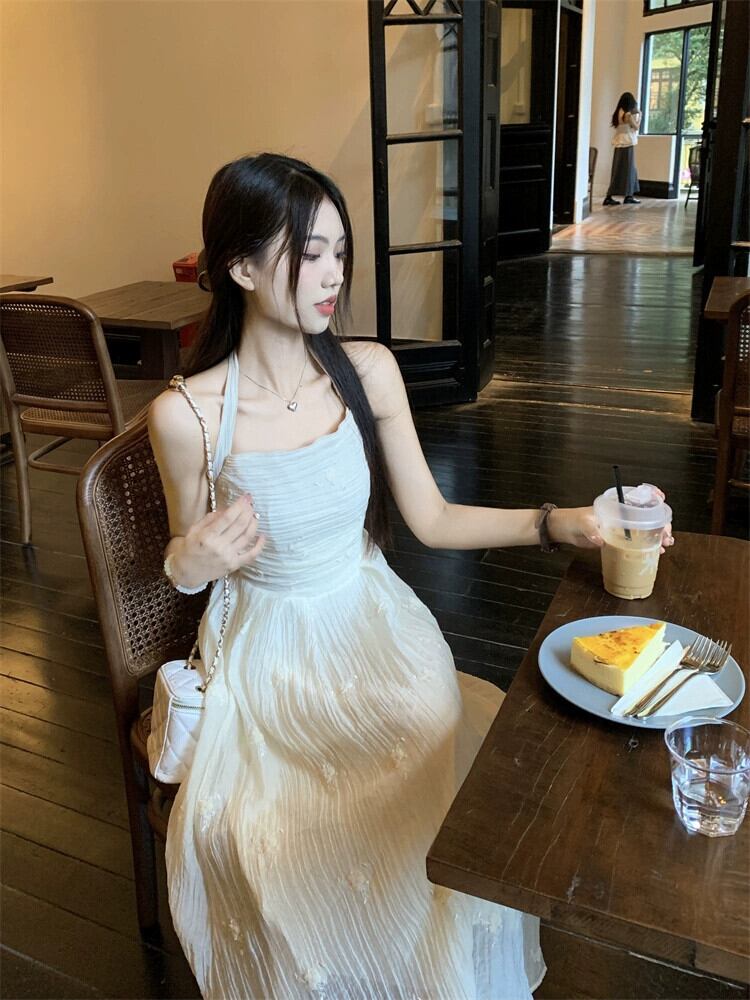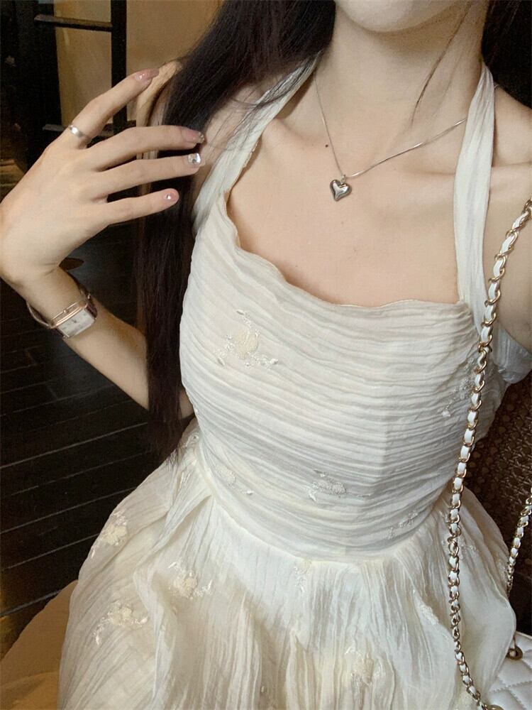 気質穏やかな風刺繍ホルターネックドレス女性の夏の 2023 新しいしわウエスト痩身オールマッチミドル丈スカート レッド サマー 夏物 0921924359360096