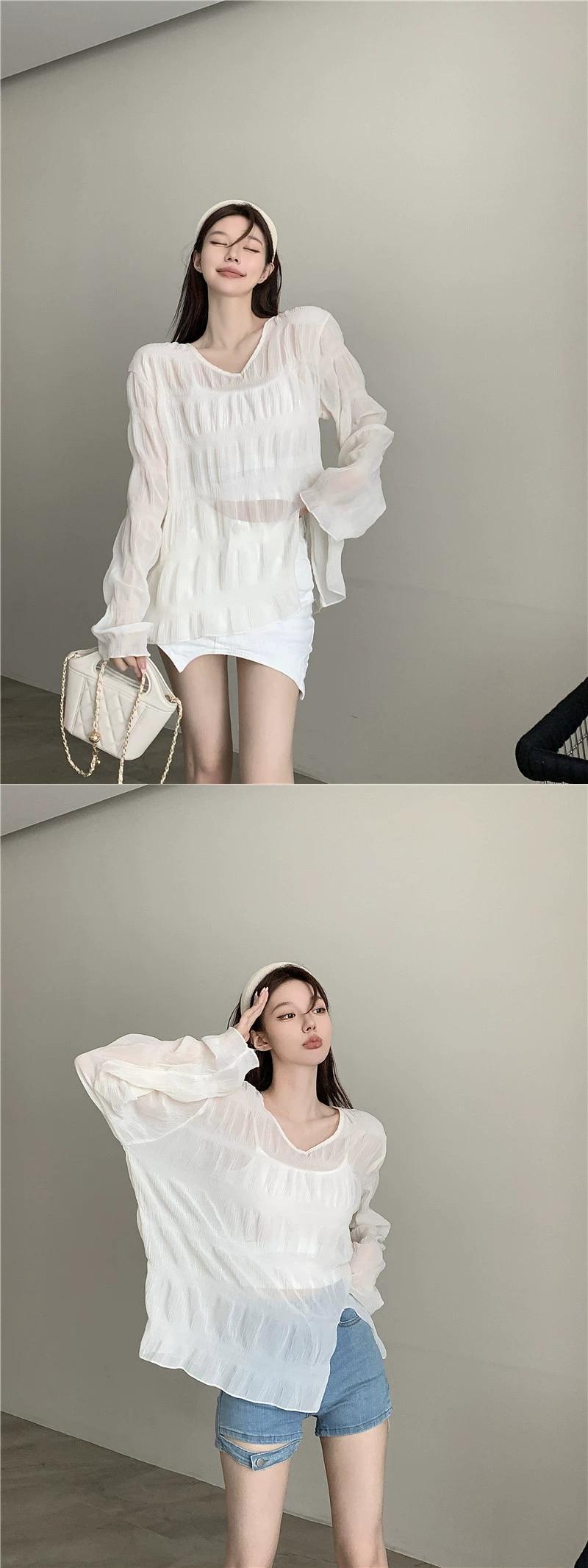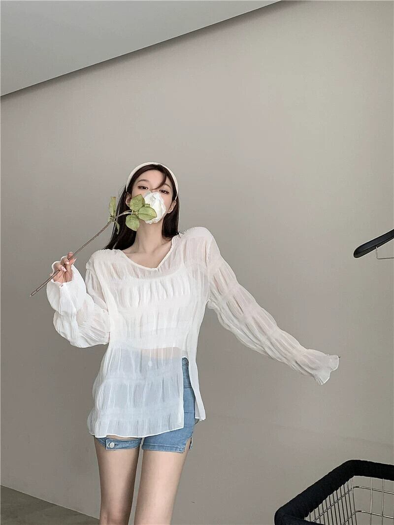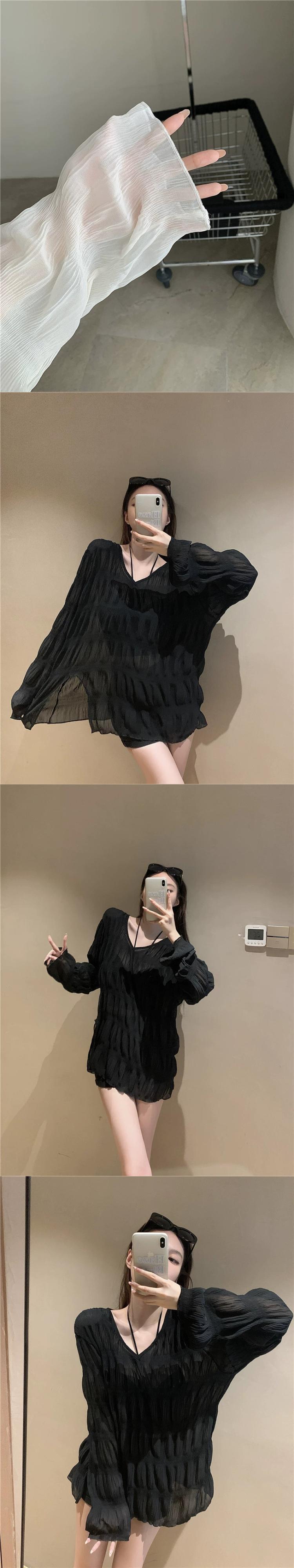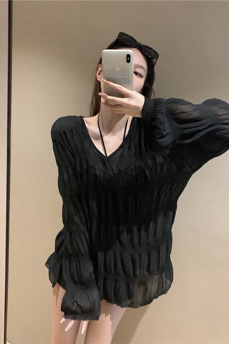 センス薄いセクションプリーツ V ネック日焼け止め T シャツレディース 2023 夏の新しいオールマッチミッドレングスゆったりと薄手のトップ サマー 夏物 Vネック Tシャツ 0921971155719273
