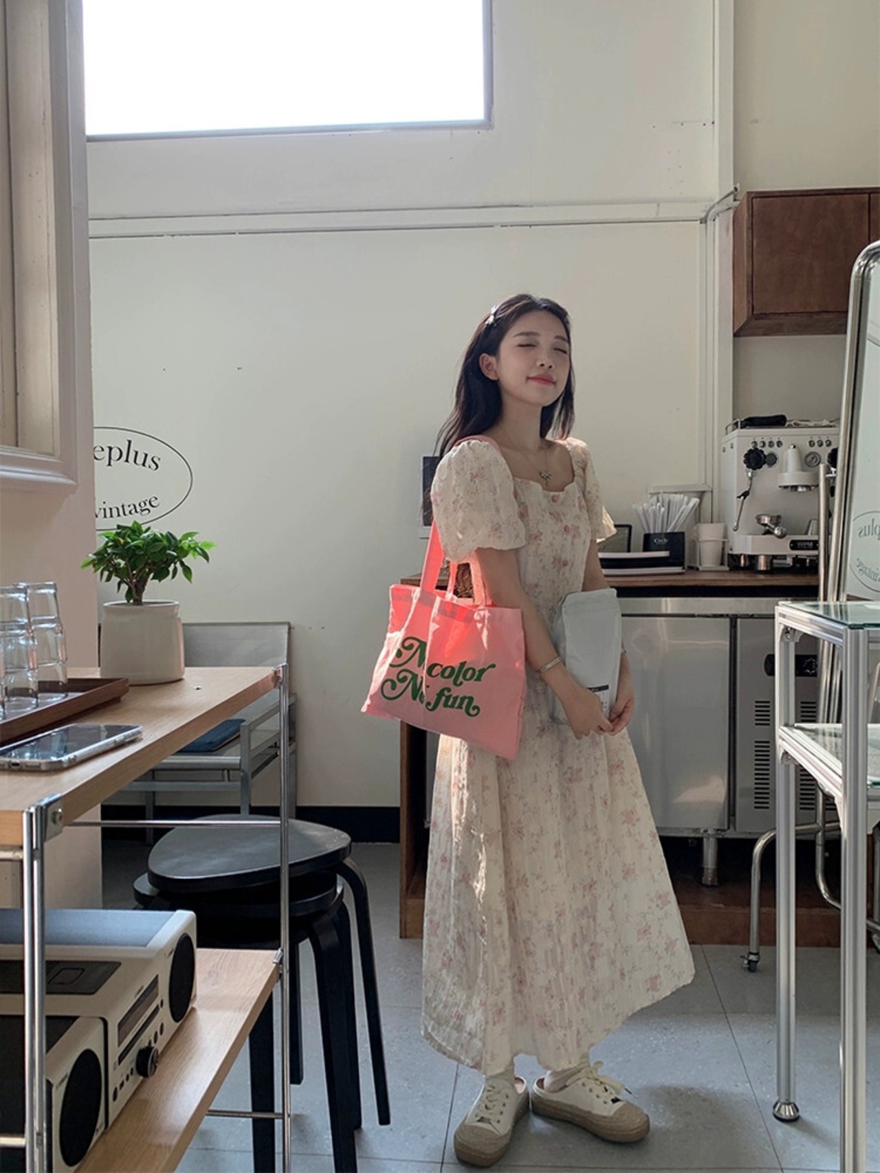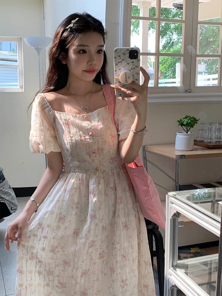 フレンチスタイルの優しい風ピンクの花柄ドレスの女性の夏 2023 新しいレトロバブル半袖ウエスト A ラインスカート サマー 夏物 Aライン 0921984293865676