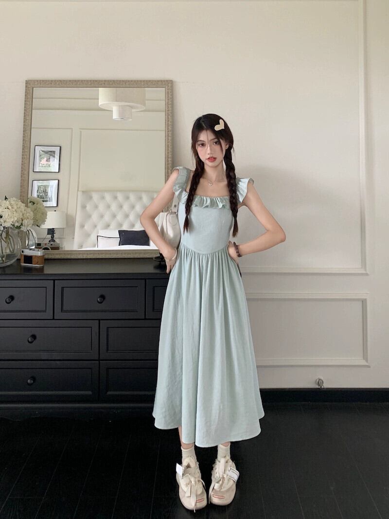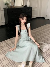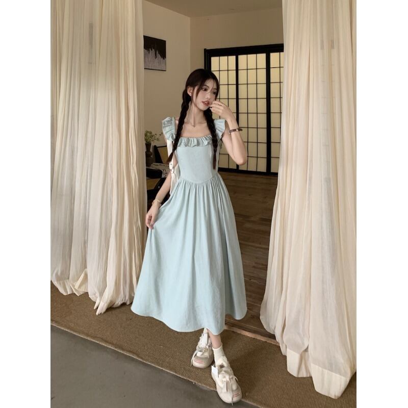 フランスのハイエンド小さな飛行袖スクエアカラードレスの女性の夏の 2023 新しい気質ウエスト痩身ミッドレングススカート サマー 夏物 スクウェア 09219399568830