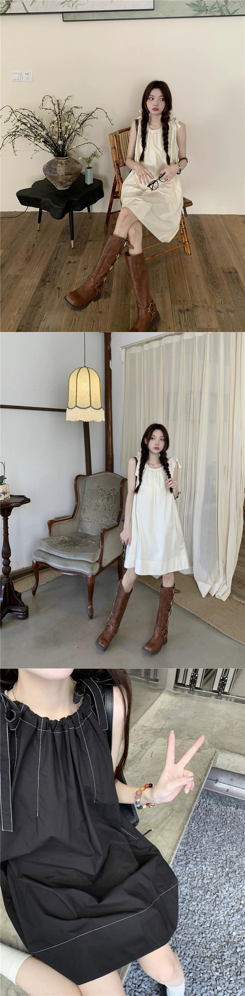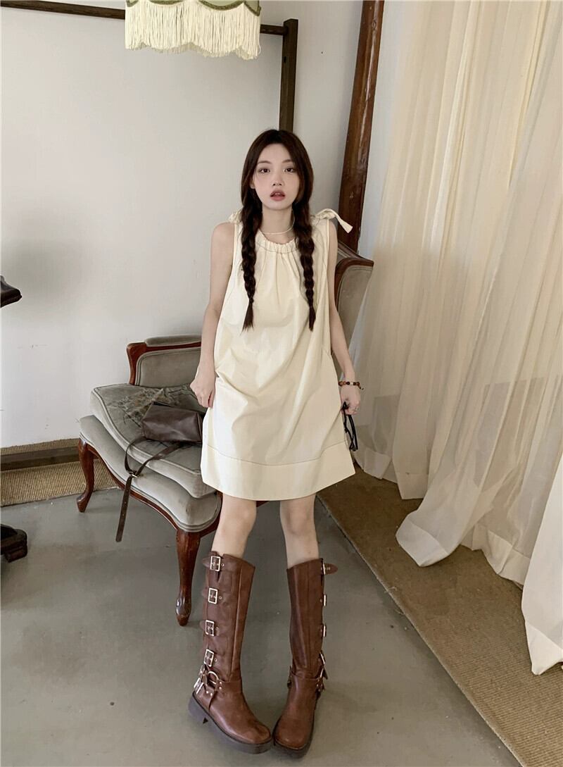 気質ラウンドネックネクタイノースリーブドレス女性の夏 2023 新バージョン無地オールマッチ薄い A ラインスカート サマー 夏物 Oネック Aライン ソリッドカラー 0921919786449611