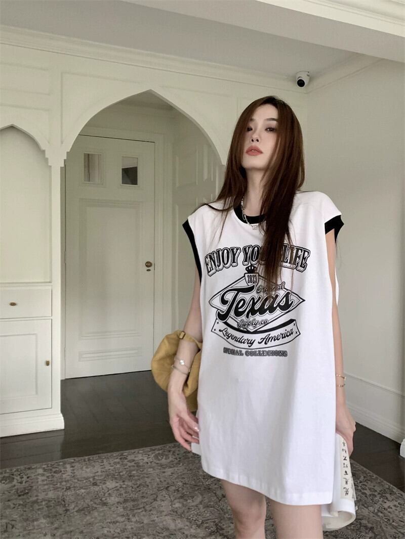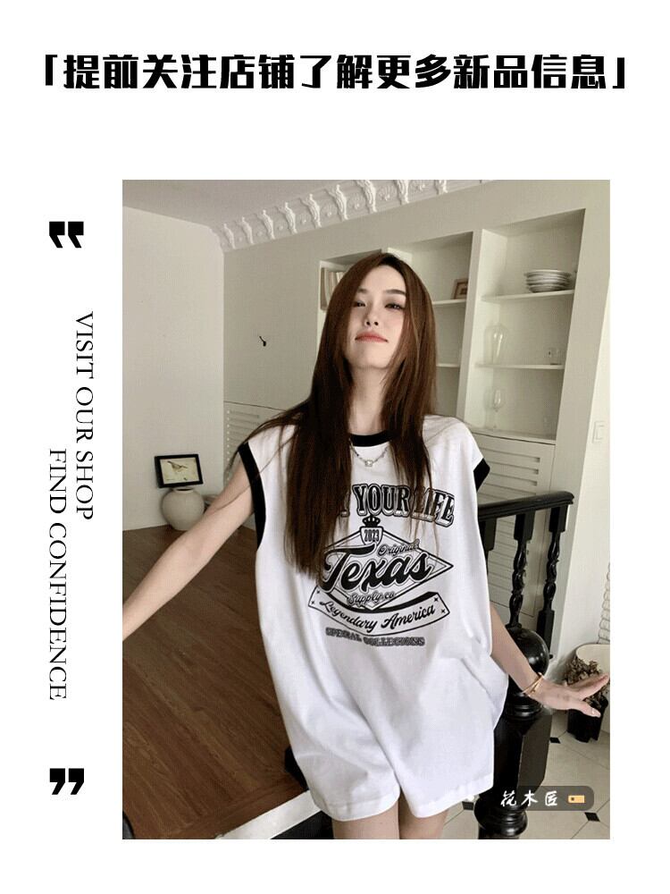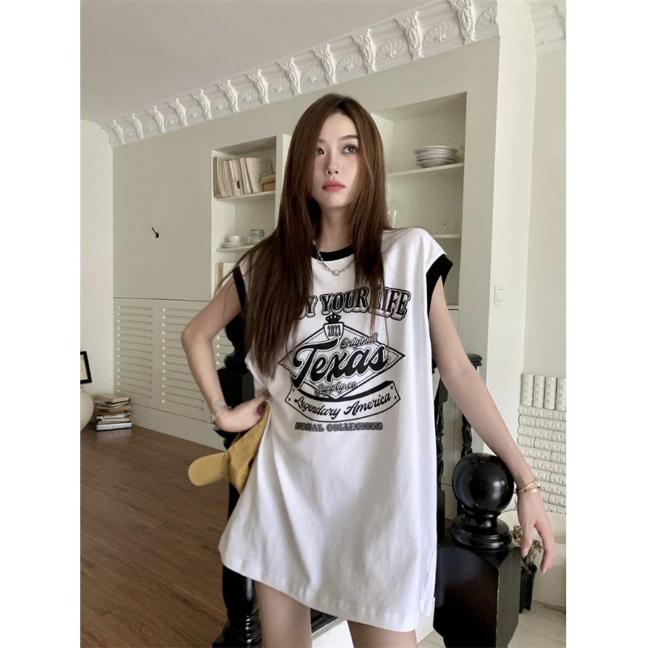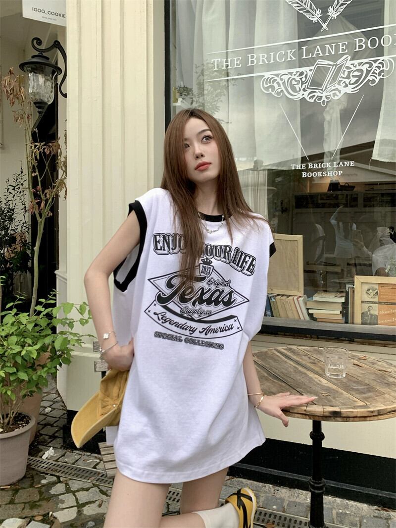 アメリカンレトロレタープリントベストTシャツレディース夏ゆったり特大ミドル丈ヒットカラートップ サマー 夏物 0921948734865816