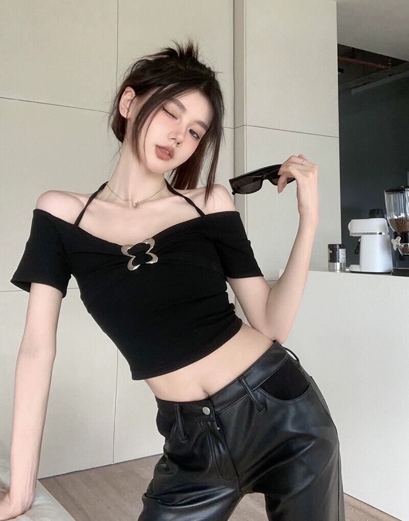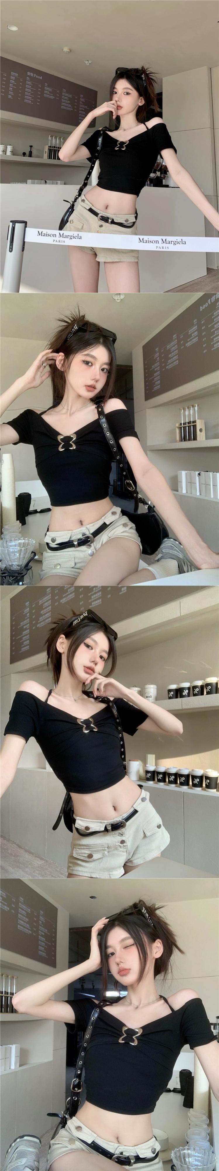 純粋な欲望一言襟ストラップレス半袖 Tシャツ女性の夏の 2023 新しいセクシーなショートスリムスリムトップ サマー 夏物 0921995890175407