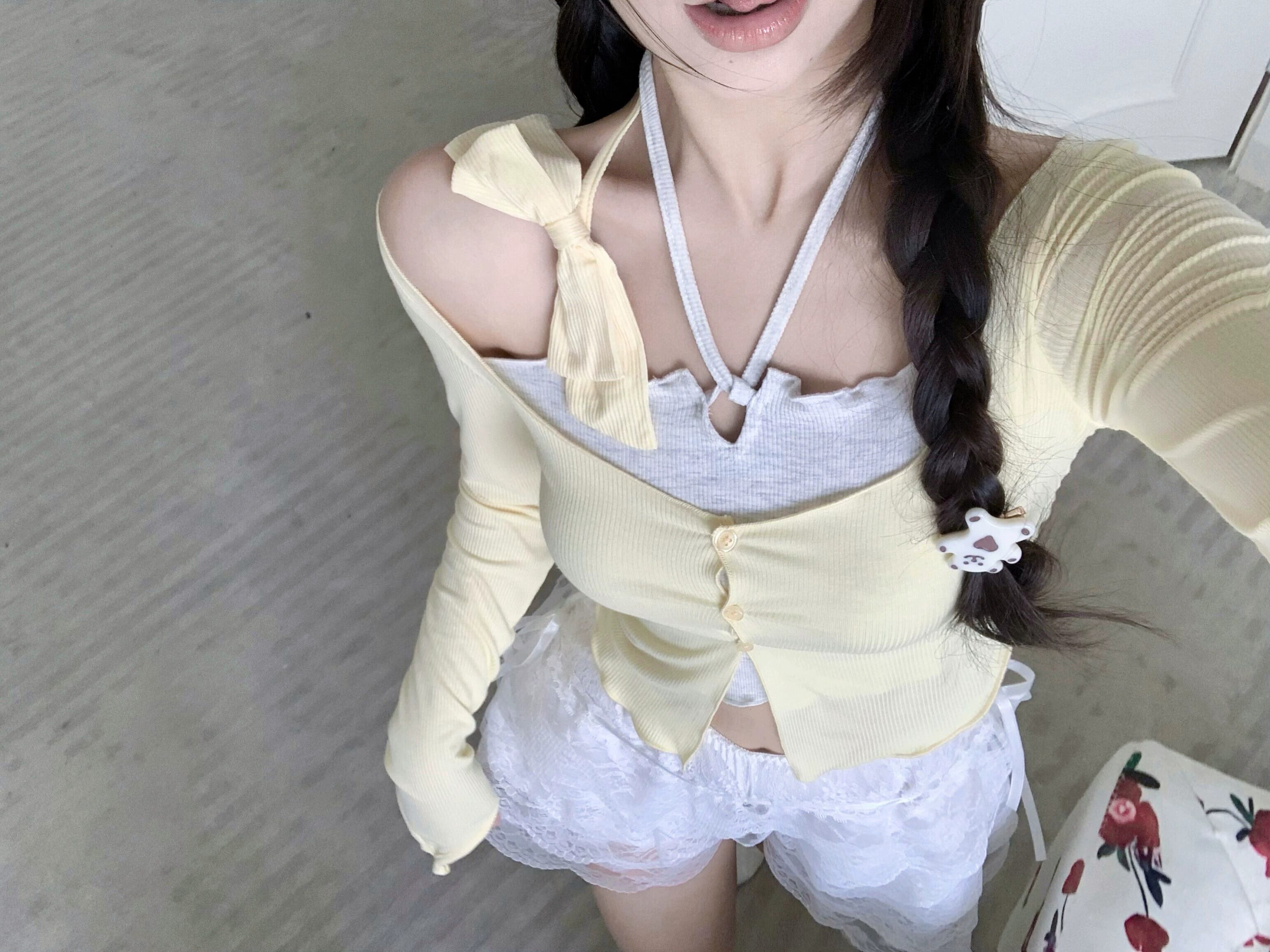 純粋な欲望偽ツーピース吊りネック長袖 Tシャツ女性のデザインセンスニッチ夏リボンステッチスリムフィットトップ ロング サマー 夏物 092196224775765