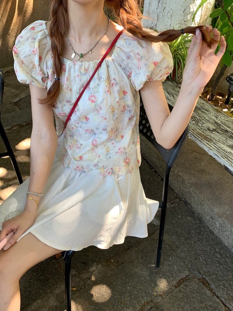 牧歌的なスタイルの花柄パフスリーブスクエアカラーシャツ女性の夏 2023 新しい気質ショートセクションスリムスリムシャツトレンディ サマー 夏物 スクウェア 092192569193115