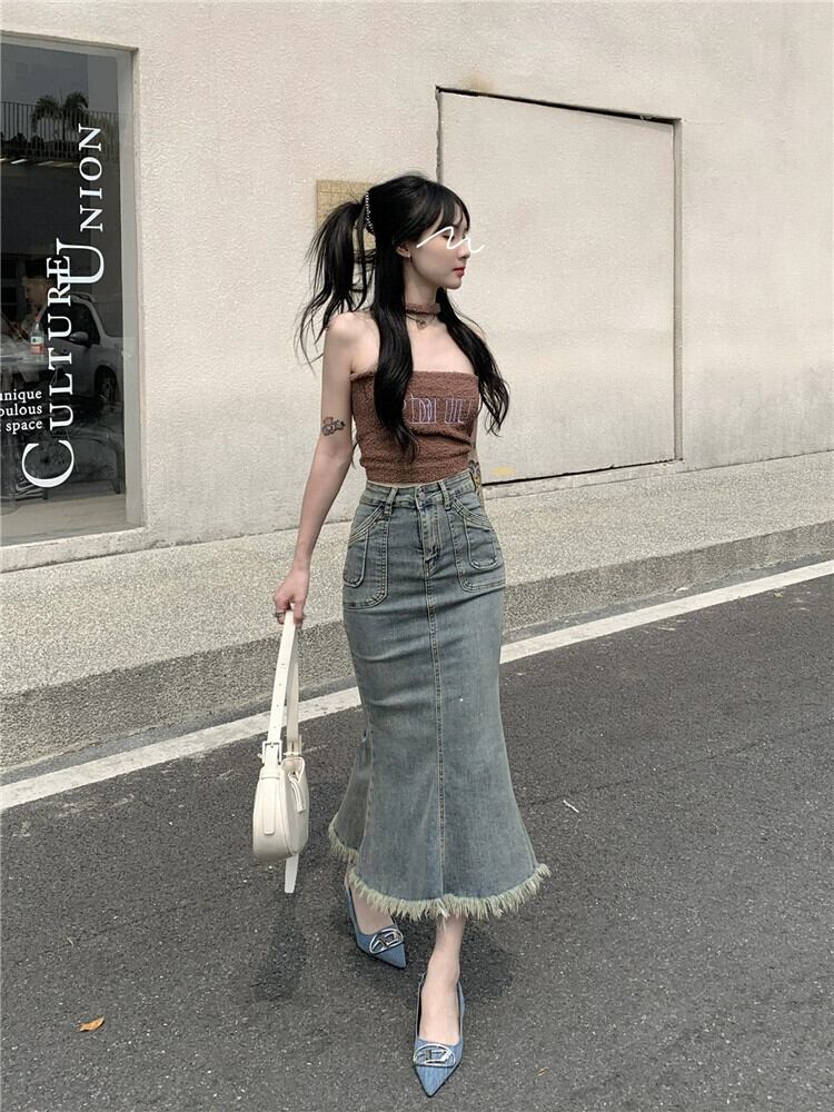 レトロなデザインセンスローエッジハイウエストスカート女性の夏の 2023 新しいスリムフィット薄型スリットバッグヒップデニムスカート ハイウェスト サマー 夏物 092193088317394
