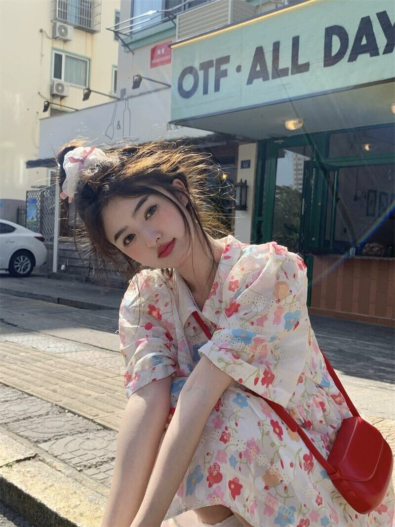 年齢を減らす花柄刺繍半袖ドレスの女性の夏の 2023 新しいオールマッチ緩くて薄いショート スカート サマー 夏物 0921982702373638