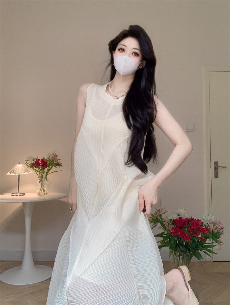 -終了フレンチプリーツベストドレスレディース2023年夏新作オールマッチ気質ルーズスリムミドル丈スカート サマー 夏物 0921927047241157