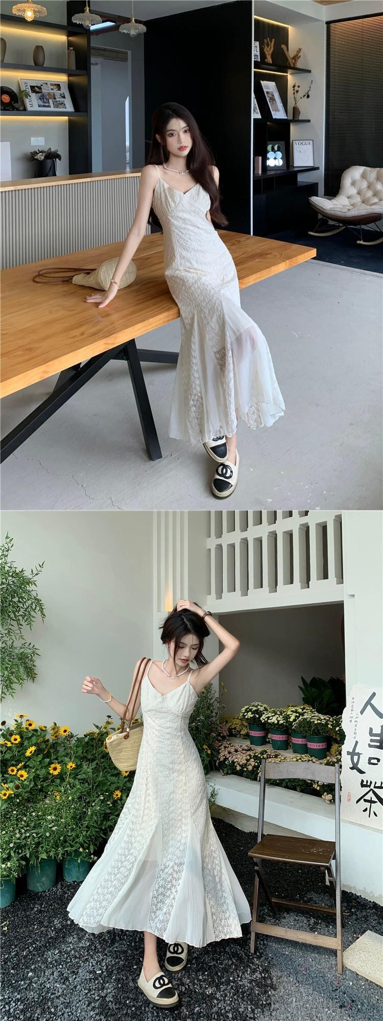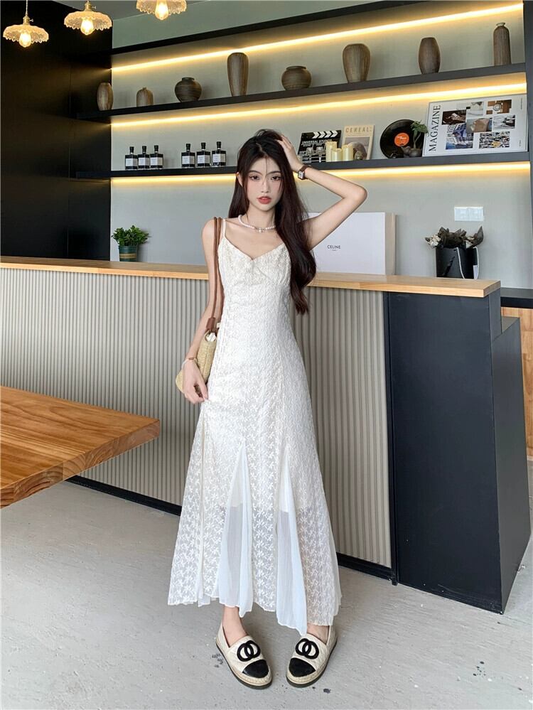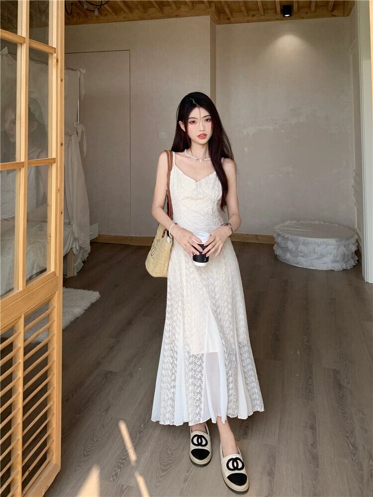 フレンチセレブスタイル V ネックサスペンダードレス女性の 2023 夏の新しい気質ウエスト痩身ミッドレングス A ラインスカート サマー 夏物 Vネック Aライン 092194849869426