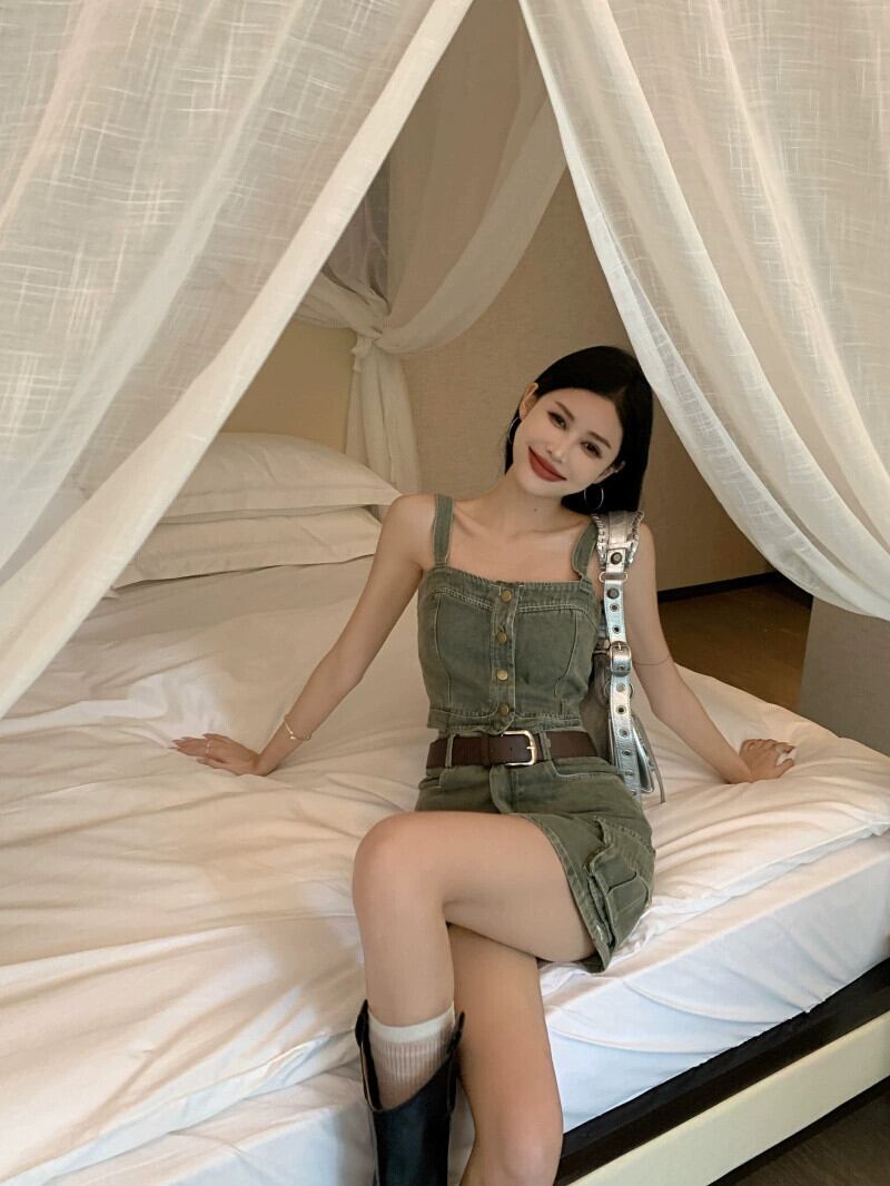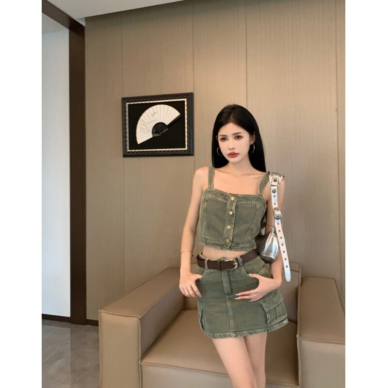 レトロなファッションスタイルのスーツの女性の夏の 2023 新しいデニムキャミソールハイウエストスカート 2 点セット ハイウェスト サマー 夏物 0921970563262786