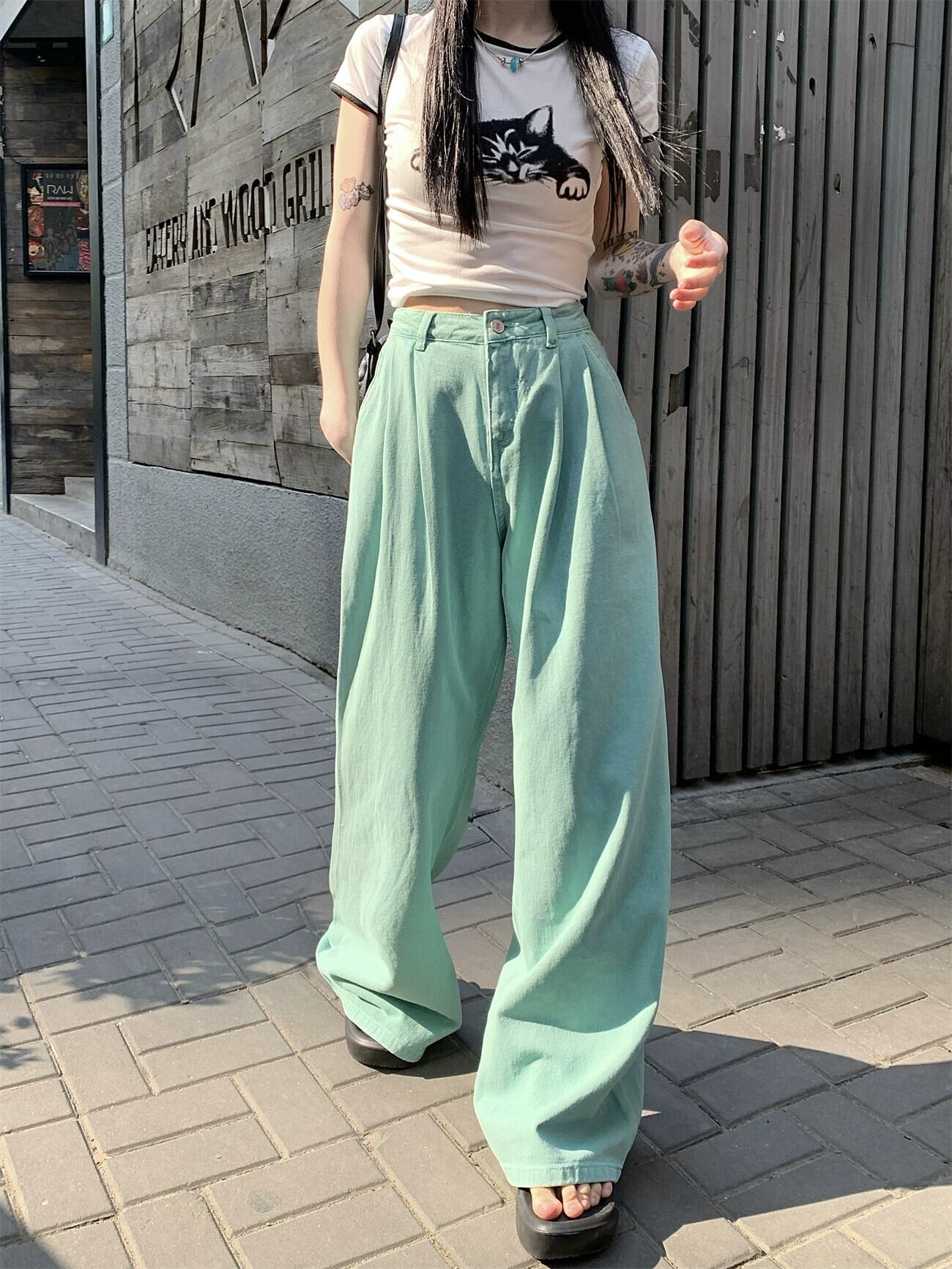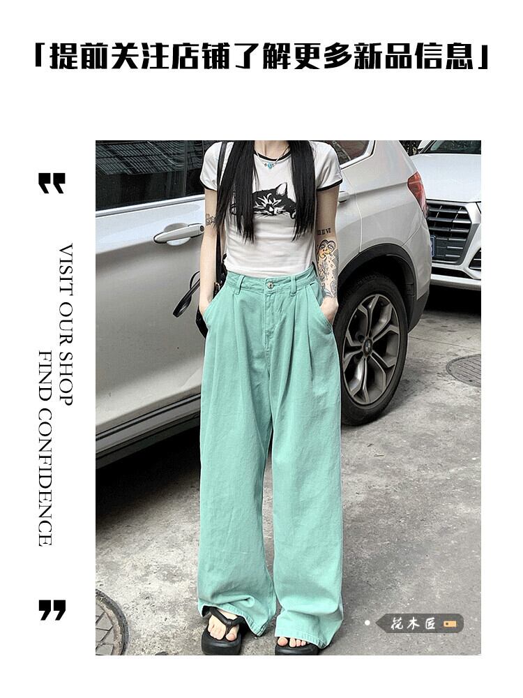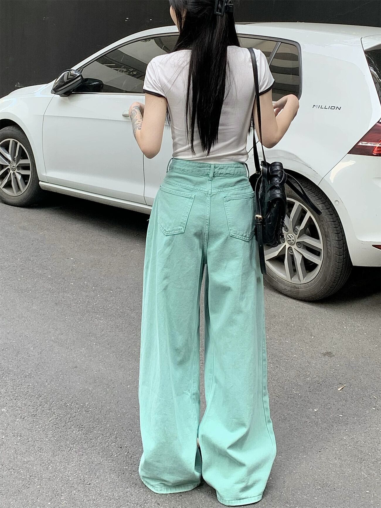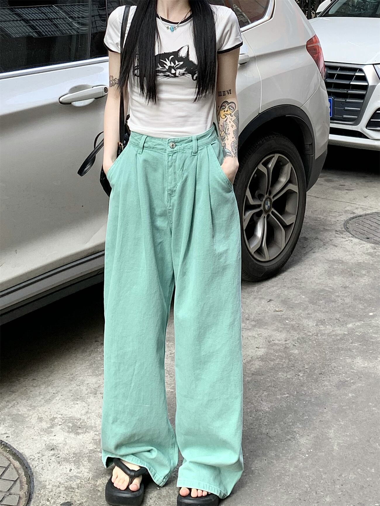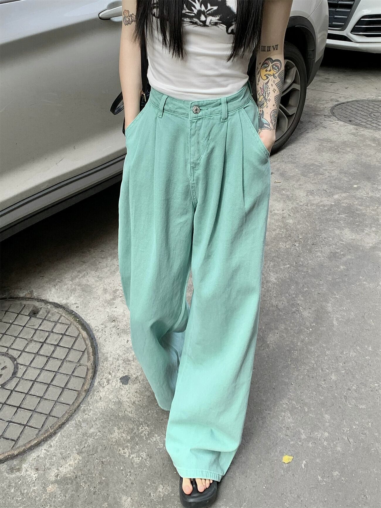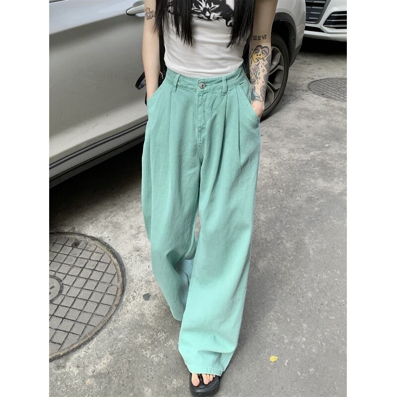 レトロブルーグリーンジーンズレディース夏ハイウエスト薄手ルーズワイドレッグパンツストレートパンツドレープモップパンツ ハイウェスト サマー 夏物 0921982171613712