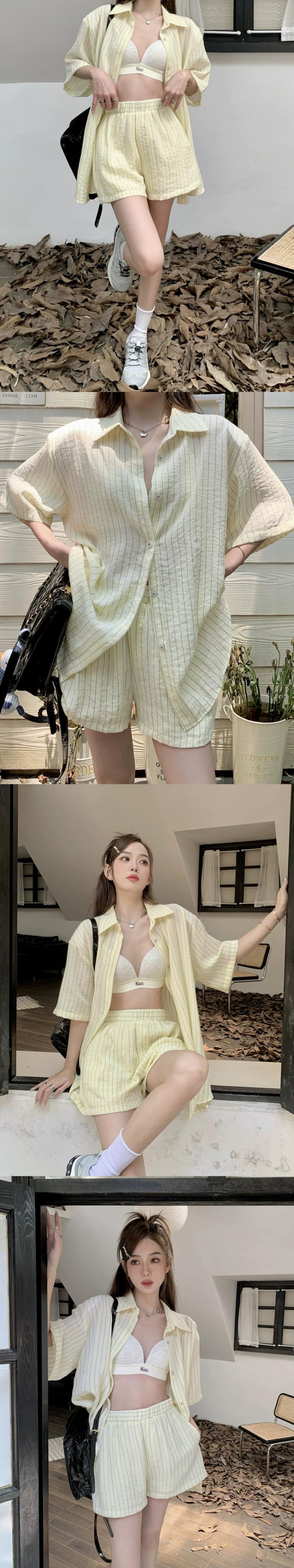 ファッションファッション年齢低減スーツ女性の夏 2023 新しいカジュアルストライプシャツハイウエストワイドレッグショーツ 2 点セット ハイウェスト サマー 夏物 ブルマー ワイドパンツ 0921964087376190