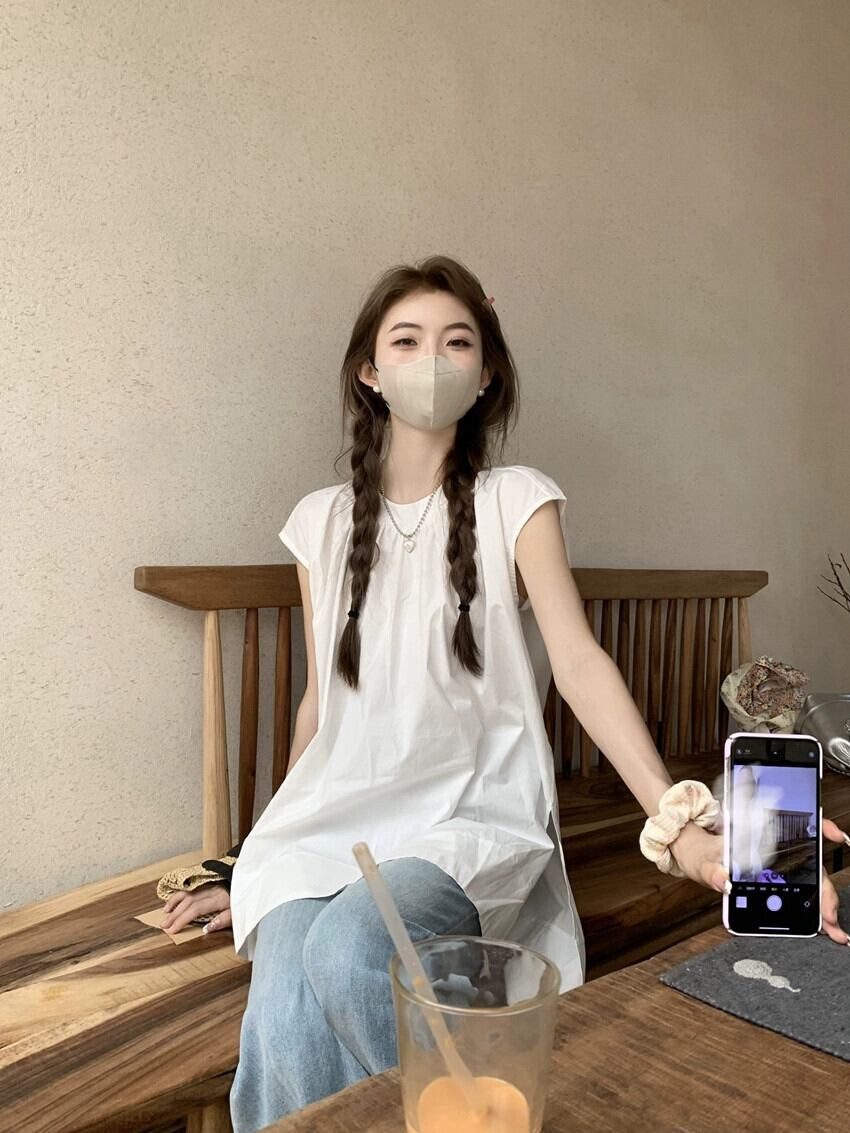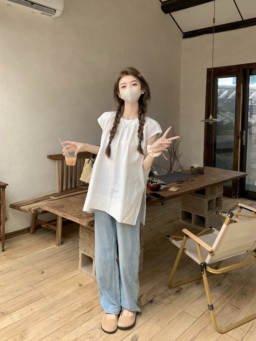 シックな無地のオールマッチノースリーブシャツのバージョンの女性の2023年夏の新しいミッドレングスのゆったりとした薄いラウンドネックトップ サマー 夏物 Oネック ソリッドカラー 0921974085024348