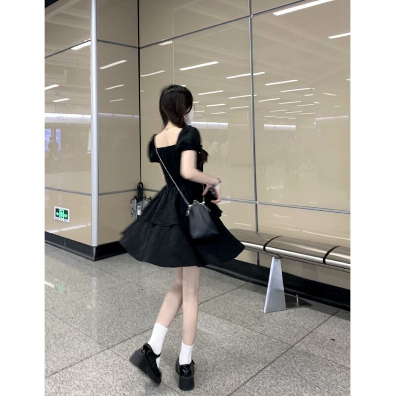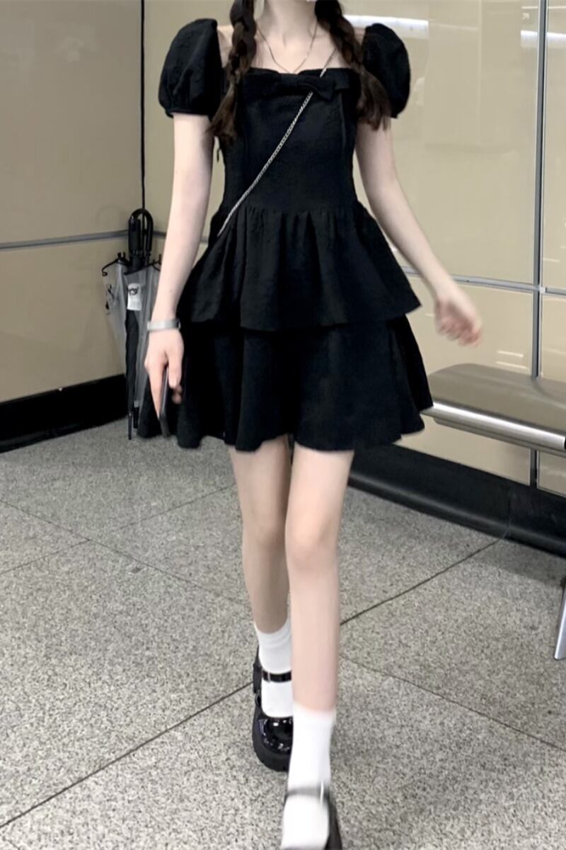 フレンチレトロスクエアカラーバブル半袖ドレスの女性の夏 2023 新年齢削減蝶ネクタイウエストリトルブラックドレス リボン サマー 夏物 スクウェア 0921941007914260