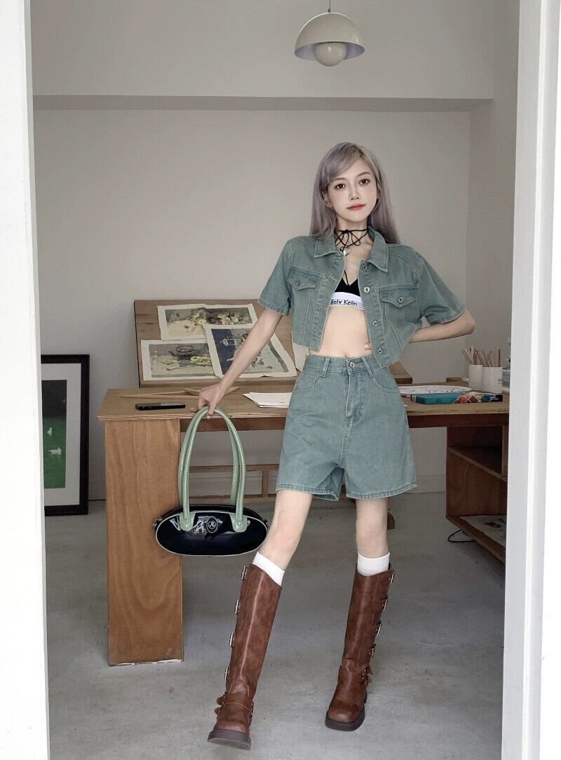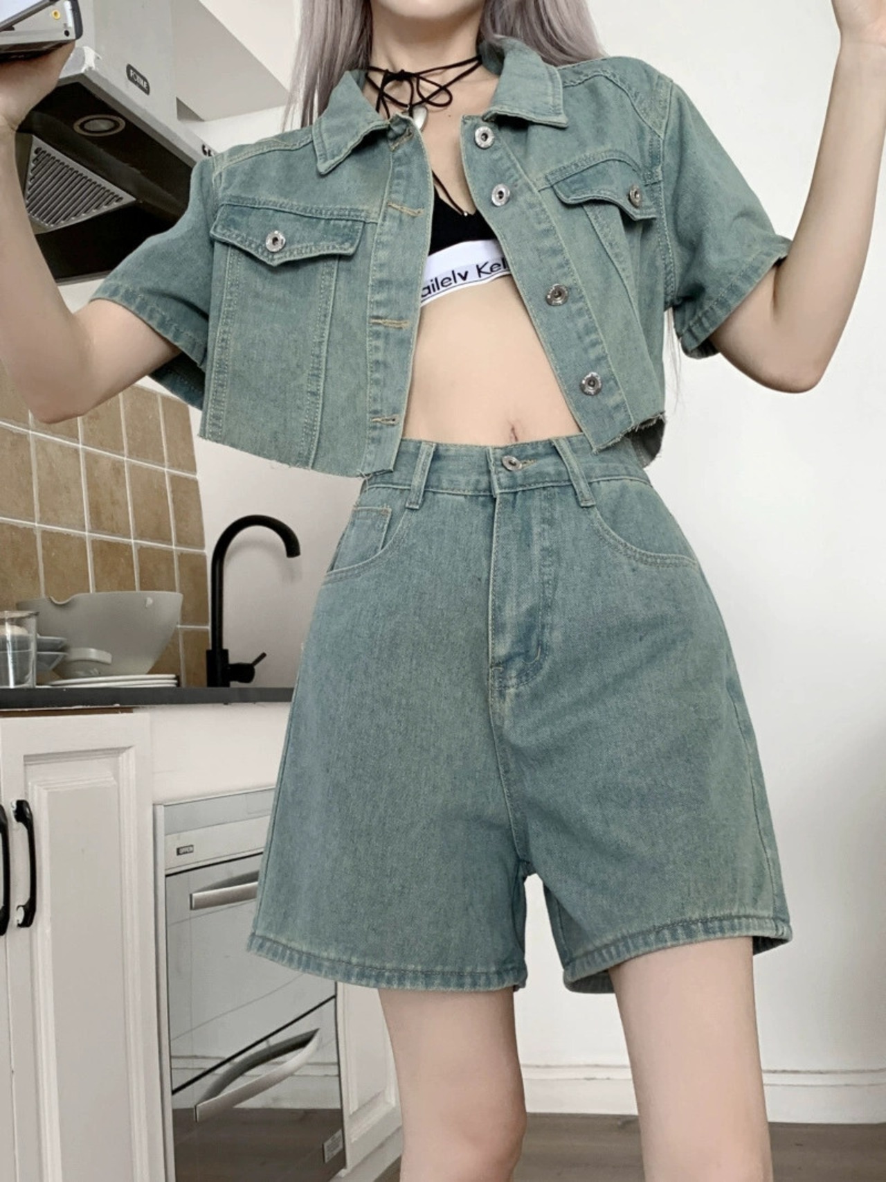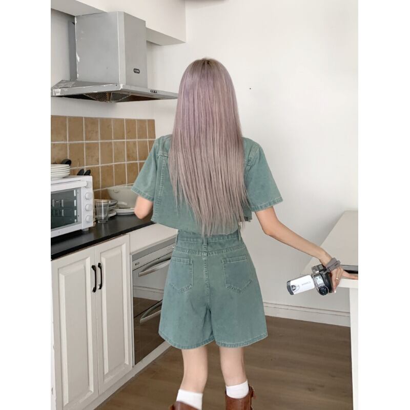 レトロデニムスーツレディース 2023 夏の新作ショートカーディガンシャツハイウエストスリムワイドレッグショーツ 2 点セット ハイウェスト サマー 夏物 ブルマー ワイドパンツ 0921978350094635