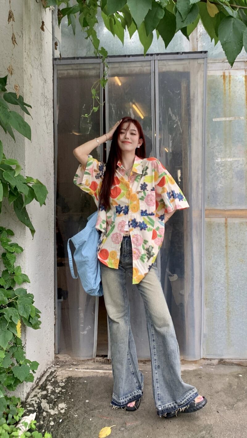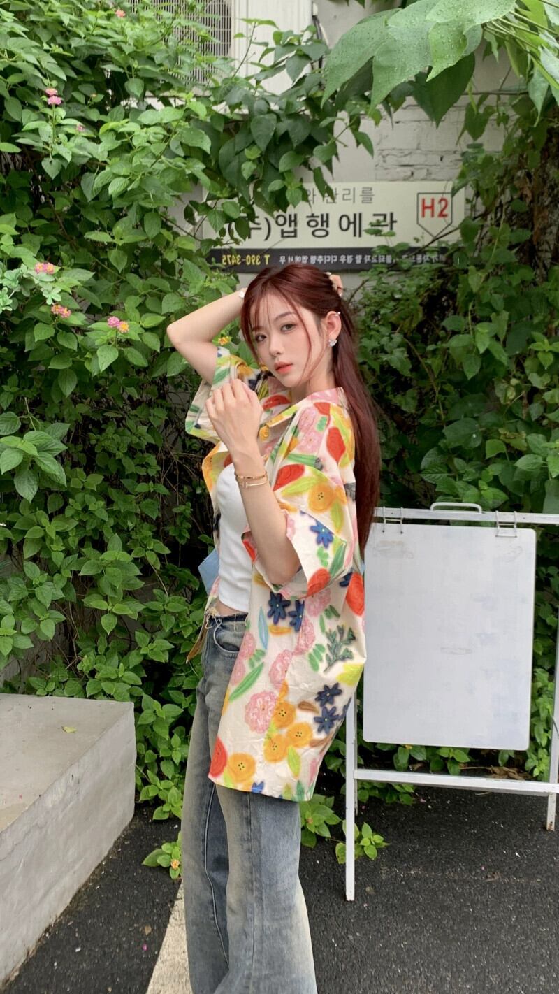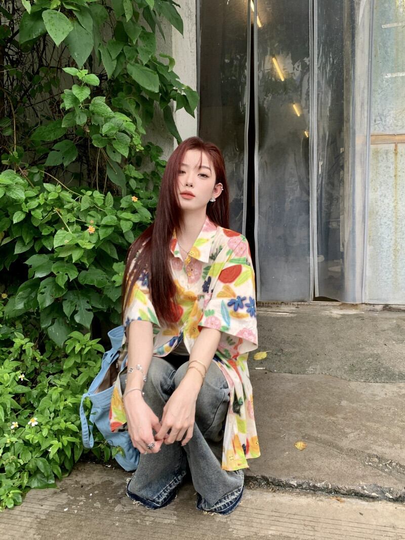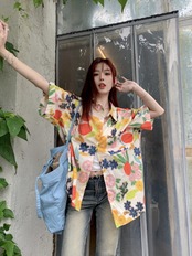 ホリデースタイルプリント半袖シャツジャケットレディース2023年夏新気質ポロカラーミドル丈カーディガントップ サマー 夏物 0921993837123443