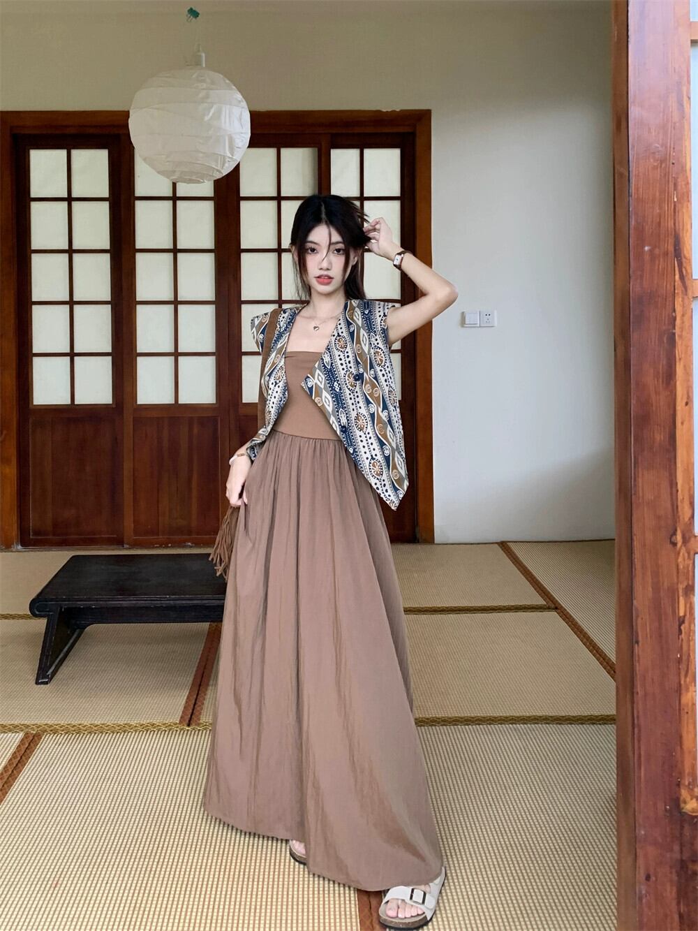 レトロな気質スーツスカート夏 2023 プリントベストカーディガンチューブトップドレス 2 点セット サマー 夏物 0921987965325714