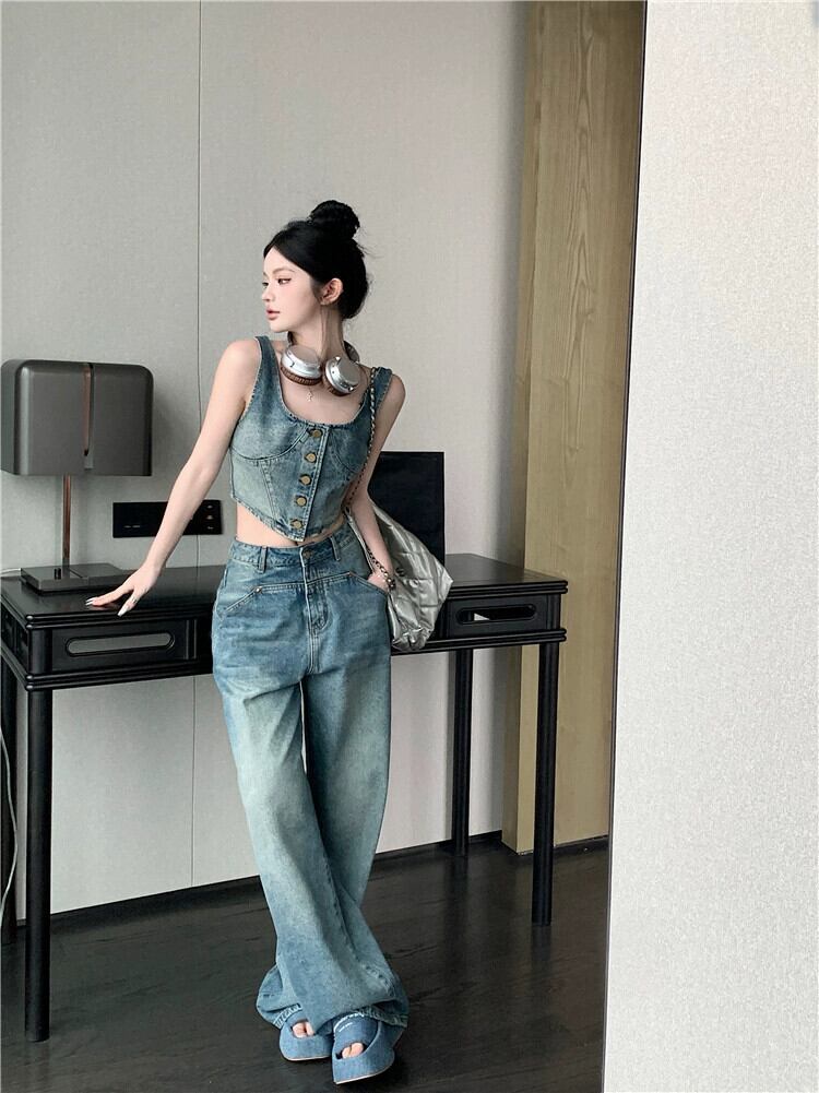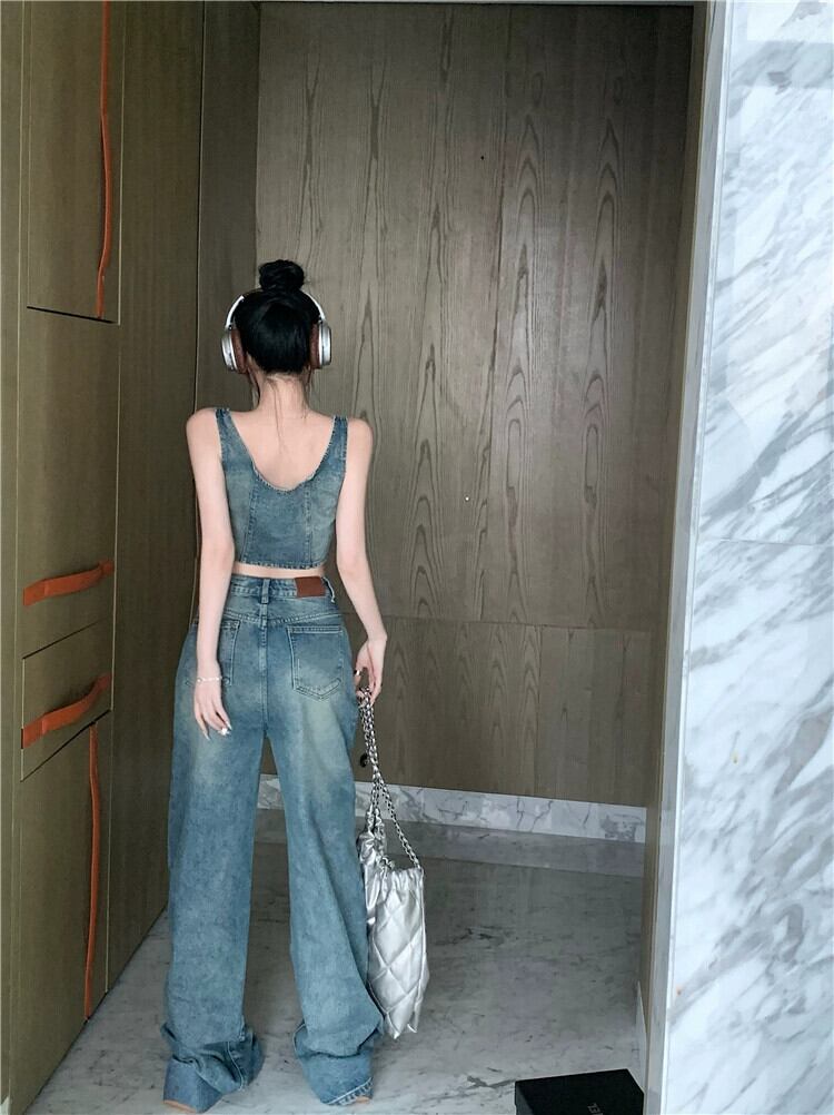 スパイスガールスタイルレトロデニムスーツ女性の夏 2023 ショートキャミソールウエストワイドレッグパンツ 2 点セット サマー 夏物 ワイドパンツ 0921960948002598