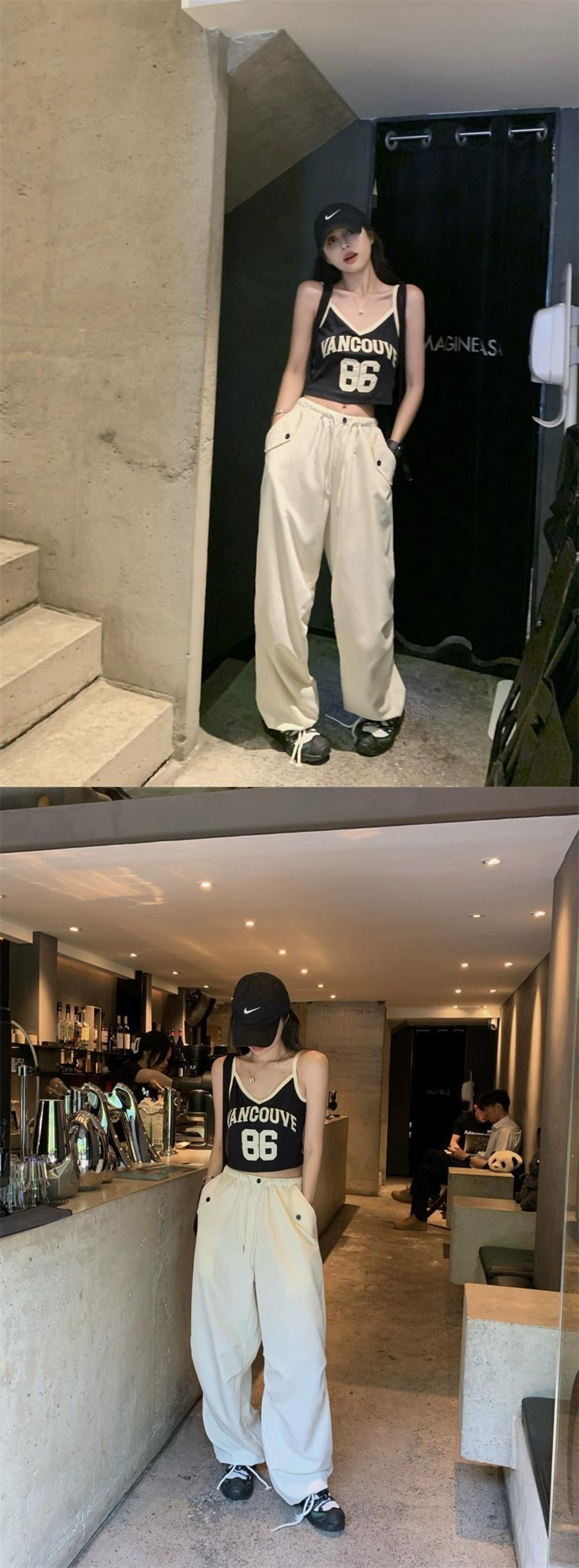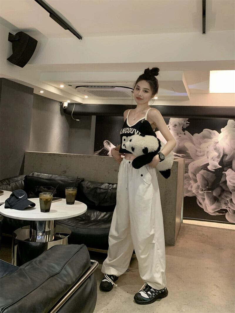 アメリカンスタイルの緩いしわポケット弾性ウエスト巾着オーバーオールパンツ女性の夏のスーツスポーツショートキャミソール エラスティック 伸縮 サマー 夏物 0921984055282649