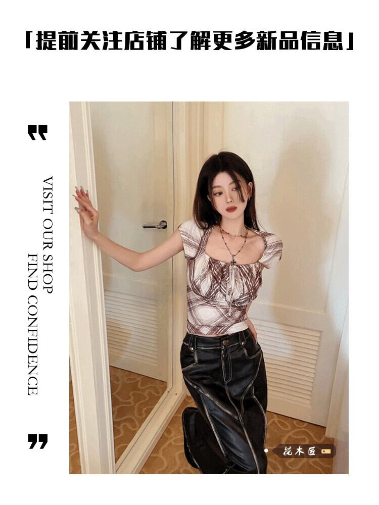 オールマッチチェック柄スクエアカラー半袖シャツ女性の夏セクシーなスリムスリム巾着ショートトップ サマー 夏物 スクウェア 0921956538165106