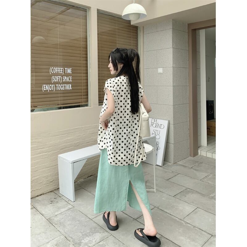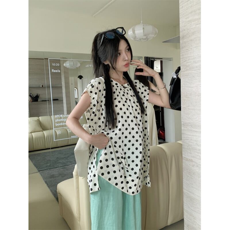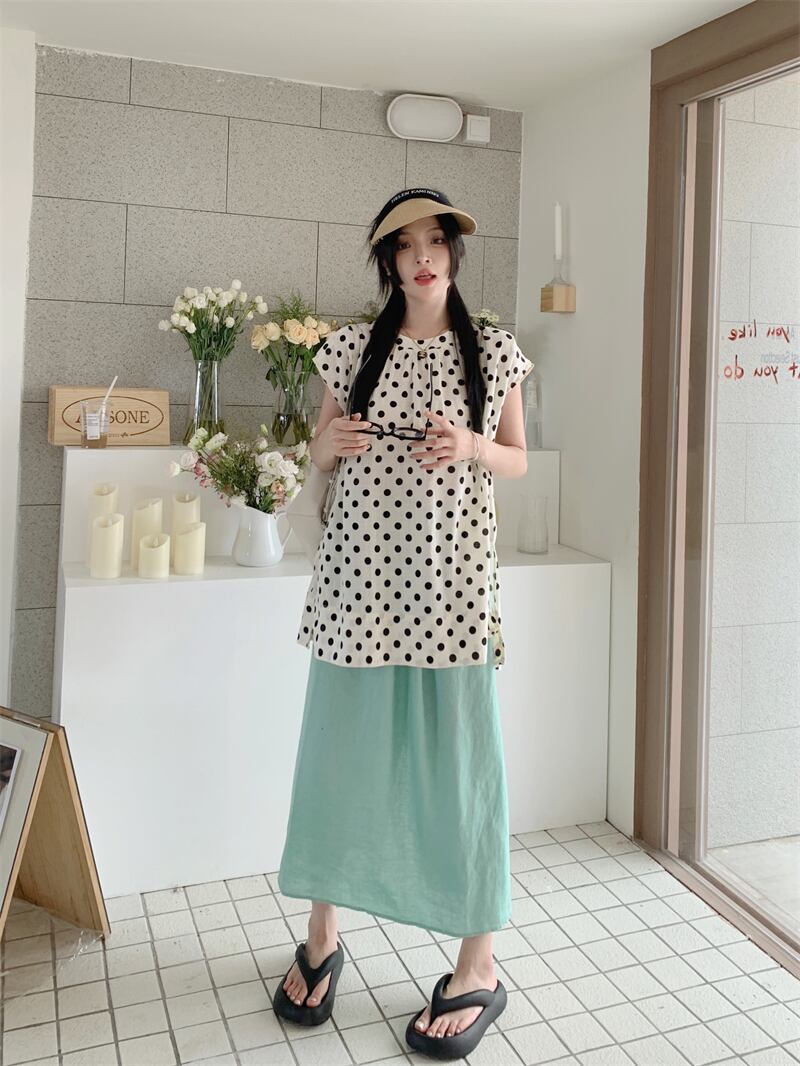 フレンチレトロ水玉半袖シャツレディース2023年夏新作ニッチ気質ルーズミッドレングススリットトップ サマー 夏物 0921911895688929