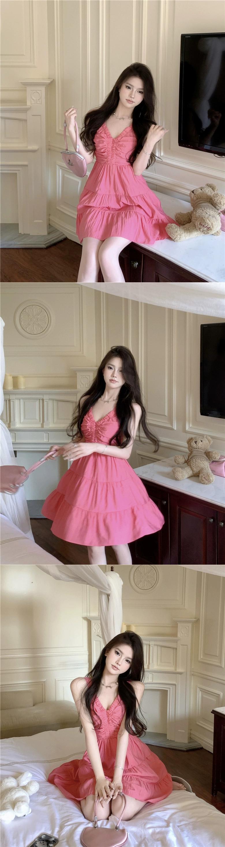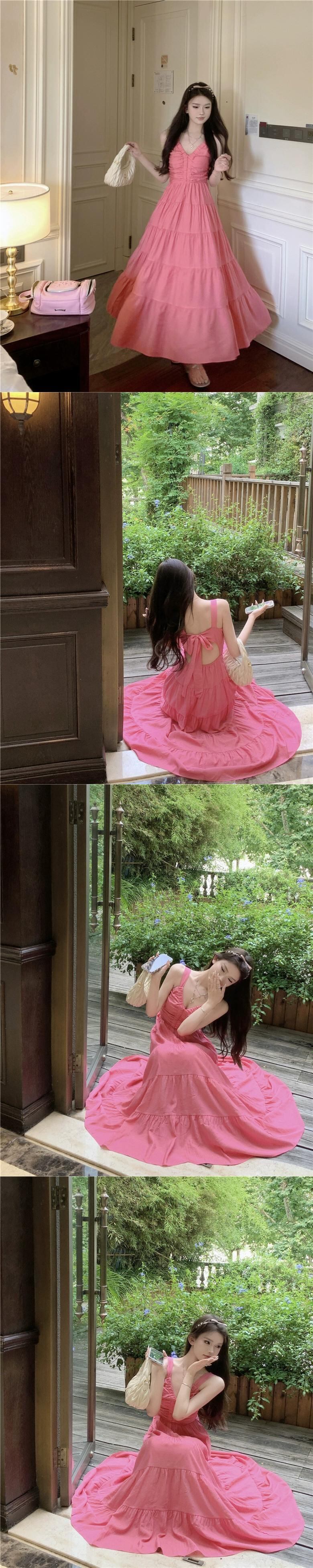 甘く優しい風プリーツ V ネックサスペンダードレスレディース 2023 夏の新作オープンバックタイウエスト A ラインロングスカート 大人ガーリー スウィート キュート カジュアル サマー 夏物 Vネック Aライン 0921981622292774