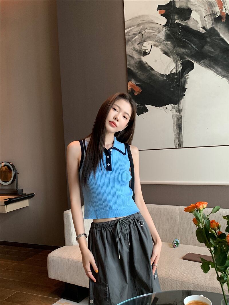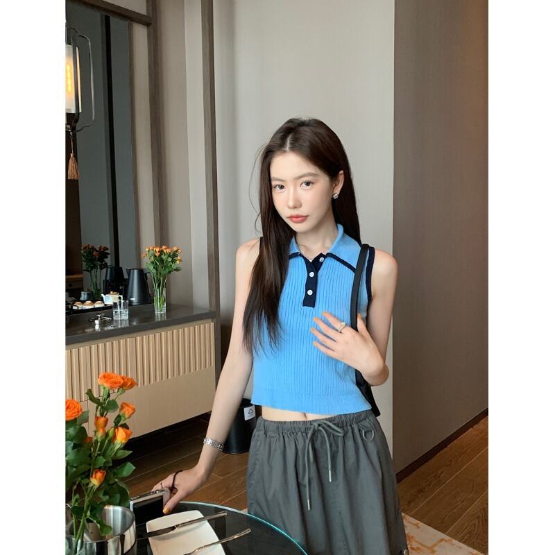スタイルシックなカラーコントラストノースリーブニットベスト女性の夏の 2023 新しいファッションポロ襟スリムフィットトップ サマー 夏物 0921951952995266