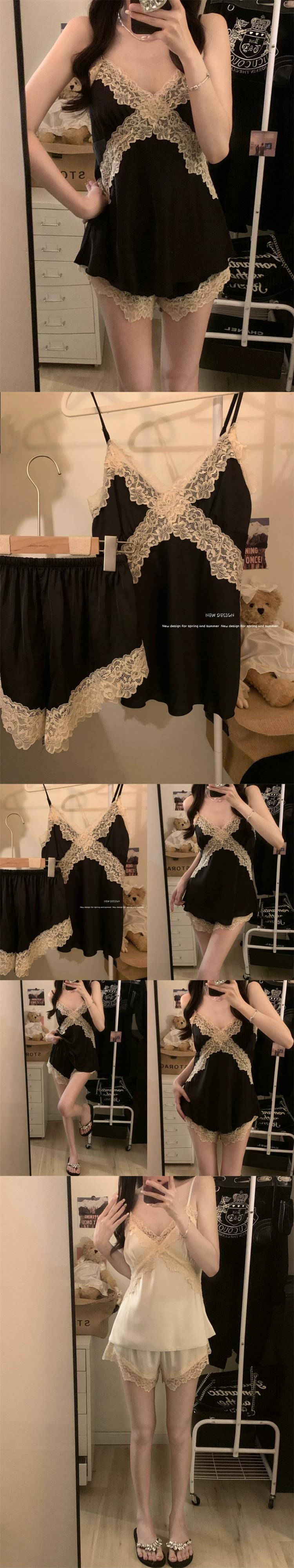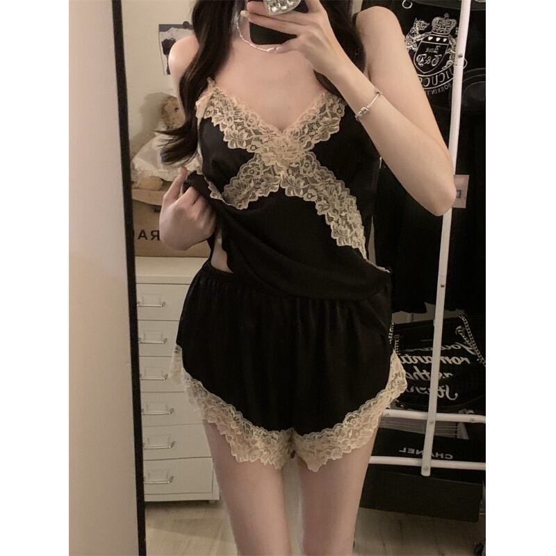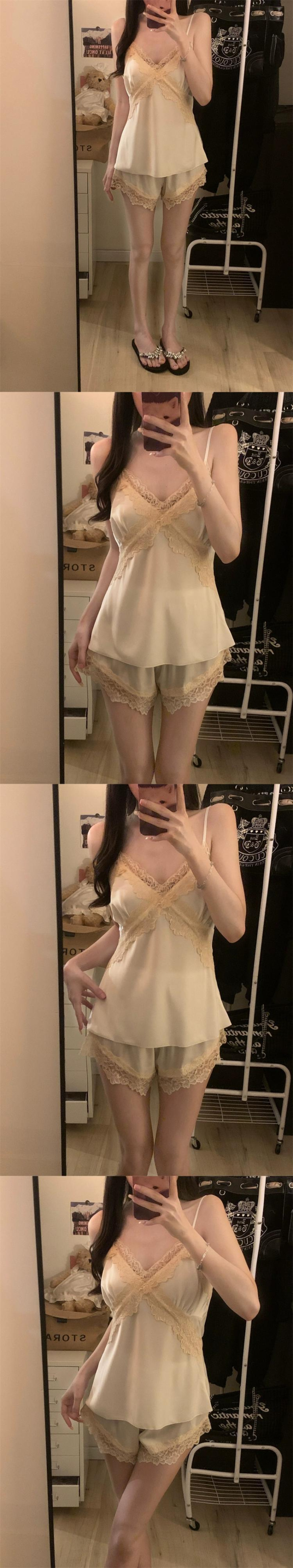 セクシーなレース V ネックアイスシルクキャミソールトップ女性の夏のパジャマセットショーツホームウェア 2 点セット サマー 夏物 ブルマー Vネック 0921967786665011