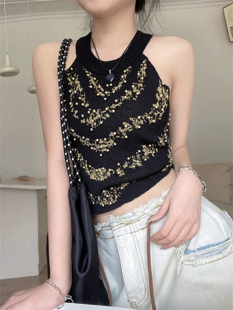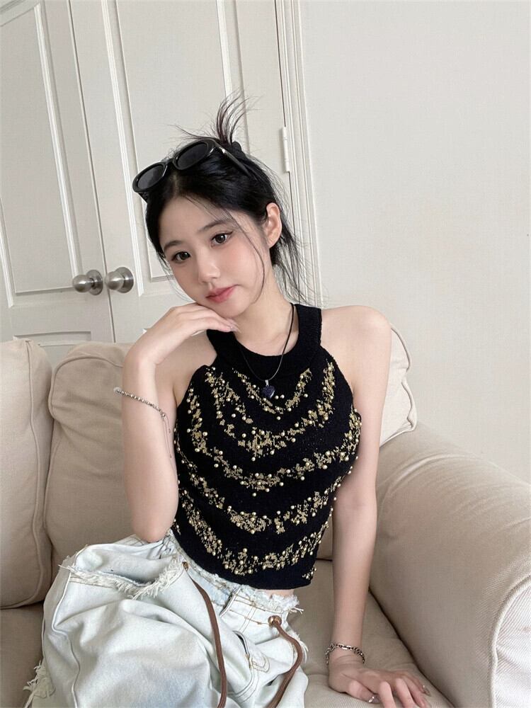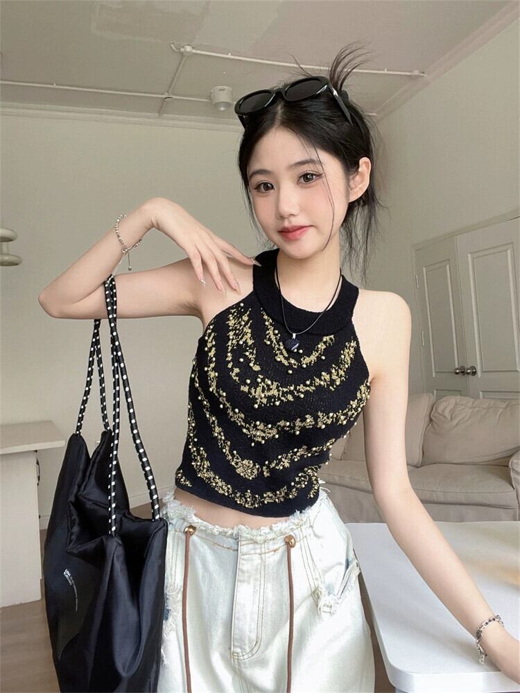 フレンチスタイルの小さなお香スタイルネイルビーズハンギングネックストラップ小さなベスト女性の夏のデザイン自己修養の感覚ショートノースリーブニットトップ 半袖 ハーフスリーブ サマー 夏物 0921946170842644