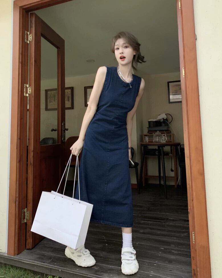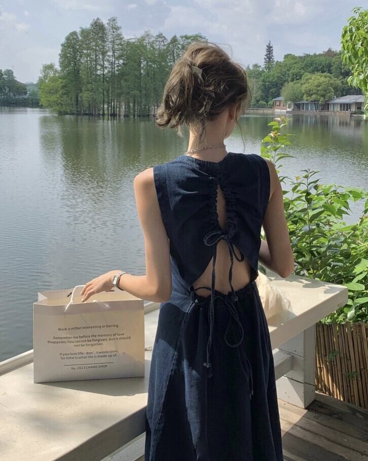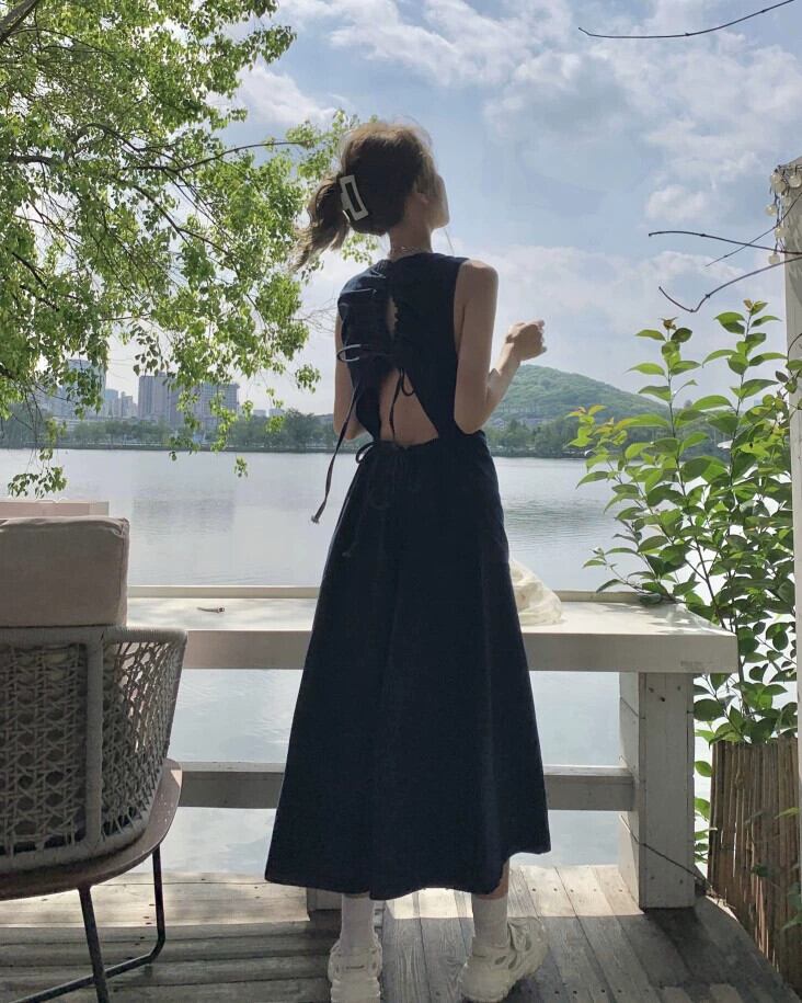 レトロバック中空ストラップノースリーブドレス女性の夏の2023新しいミッドレングススリムデニムスカート サマー 夏物 0921964639378213