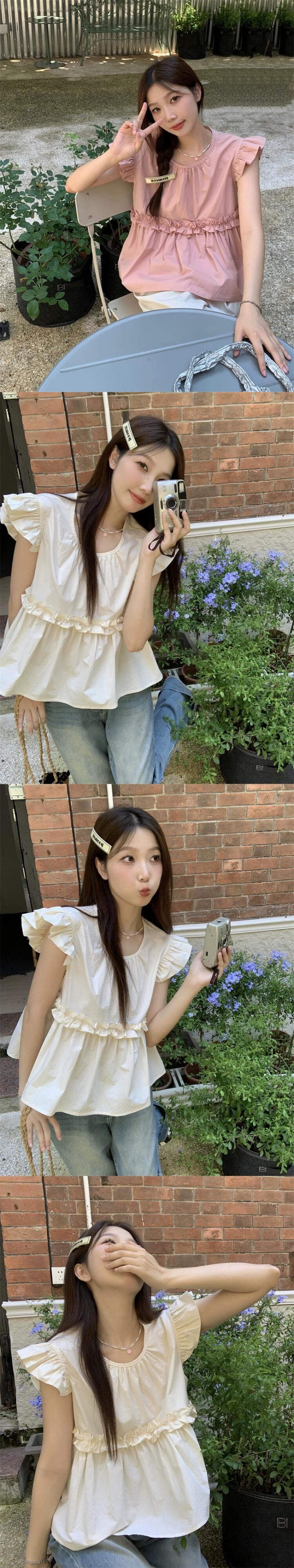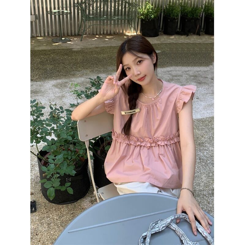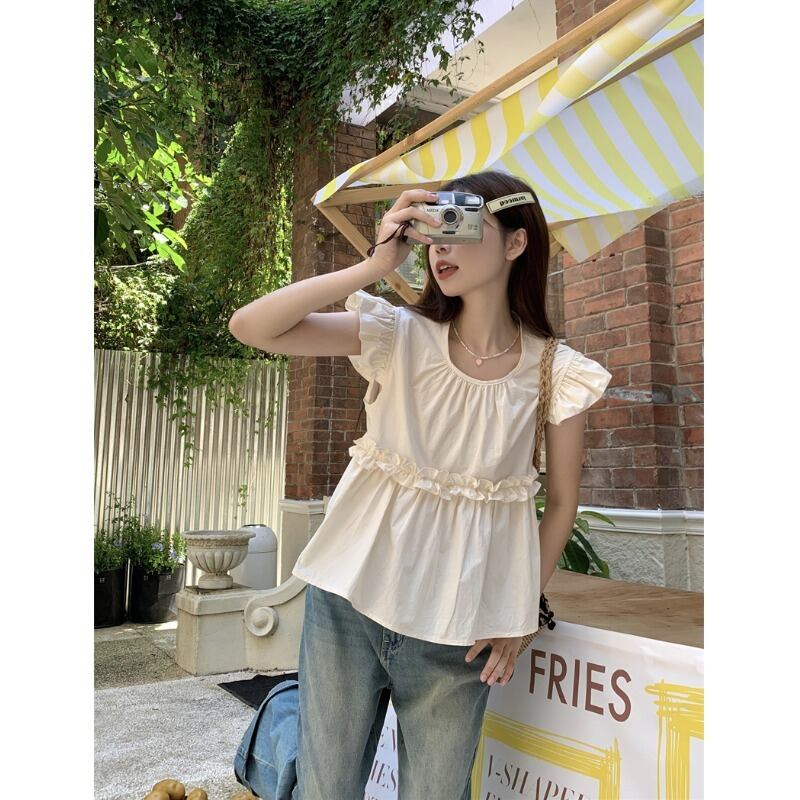 甘いデザインセンス小さなフライングスリーブシャツ女性の夏の気質ニッチ菌サイドショートシャツルーズラウンドネックトップ 大人ガーリー スウィート キュート カジュアル サマー 夏物 Oネック 0921952115283591