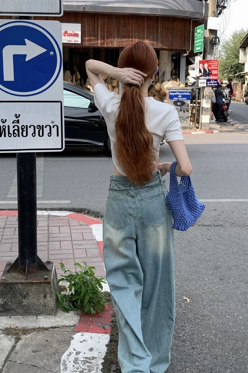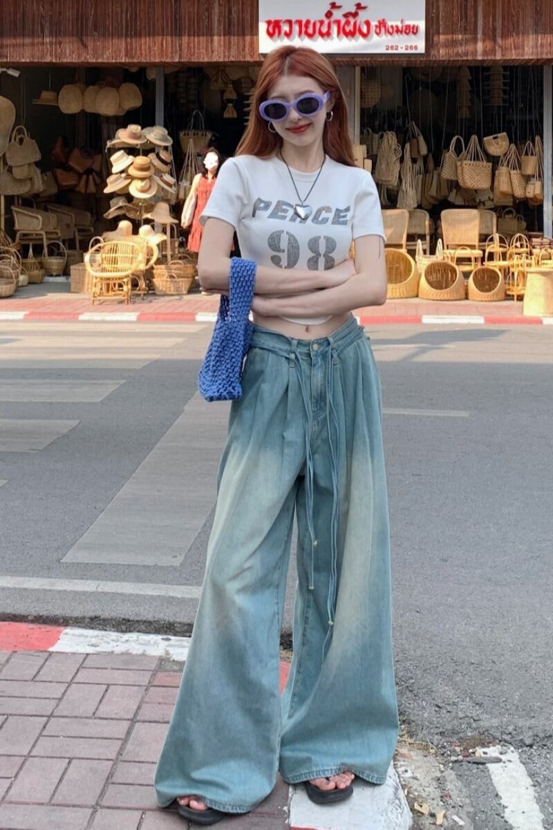 ウォッシュドブルー巾着ルーズワイドレッグジーンズ女性の夏の2023新しいストレートスリム怠惰なモップパンツ サマー 夏物 0921930119781836