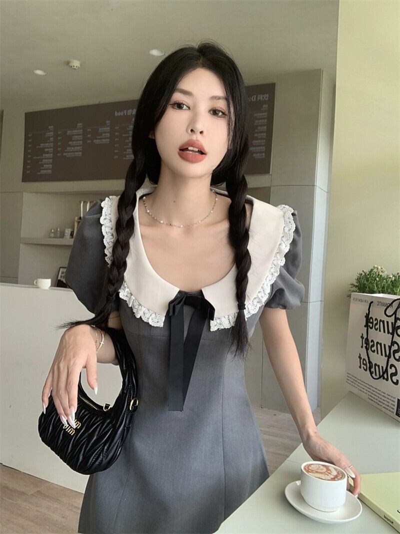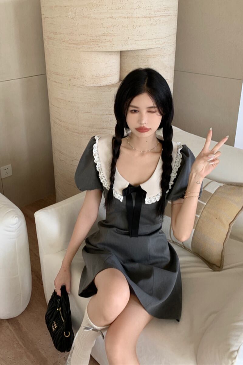 フランス風老化人形襟半袖ドレス女性の 2023 夏の新しい気質スリムスリムショートスカート潮 サマー 夏物 0921952245967639